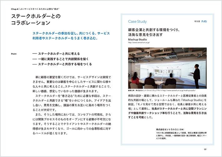 ![]() 보급 개발 콘텐츠 이미지(P.22): '이해관계자와의 협업'이라는 제목. 소제목 '이해관계자의 참여를 독려하고 함께 만든다. 서비스 이용자와 이해관계자를 잘 참여시킨다'라는 소제목에 이어 본문이 들어간다. 또한 Case Study로 'Mashup Studio'의 사례가 이미지와 함께 게재되어 있다. |