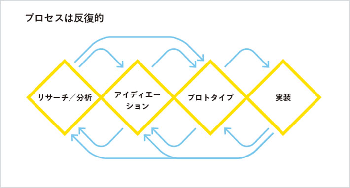 ![]() '프로세스는 반복적이다'를 나타내는 인포그래픽: 리서치/분석, 아이디어, 프로토타입, 구현의 각 단계가 상호 순환하는 서비스디자인의 유동적인 프로세스를 표현하고 있다. |