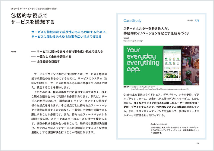 ![]() 보급 개발 콘텐츠 이미지(P.26): 제목 '포괄적인 관점에서 서비스를 구상한다'. 소제목 '서비스를 지속 가능하고 성장 가능한 것으로 만들기 위해 서비스에 관련된 모든 것을 폭넓은 시각으로 바라본다'. 에 이어 본론이 들어간다. 또한 Case Study로 'Grab'의 사례가 이미지와 함께 게재되어 있다. |