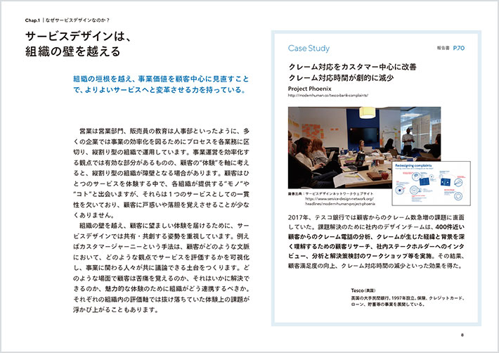 ![]() 보급 개발 콘텐츠 이미지(P.8): 제목 '서비스디자인은 조직의 벽을 넘는다'. 소제목 "조직의 울타리를 넘어 사업 가치를 고객 중심으로 재검토함으로써 더 나은 서비스로 변화시키는 힘을 가지고 있다." 에 이어 본론이 들어간다. 또한 Case Study로 'Project Phoenix' 사례가 이미지와 함께 게재되어 있다. |