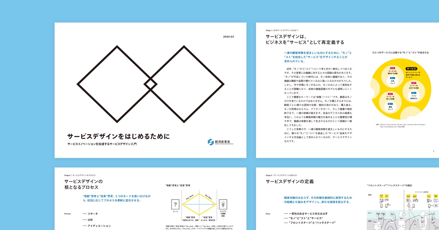 안녕하세요, 서비스디자이너 카와하라다입니다. 2020년 4월, 경제산업성에서 상거래・서비스 환경의 적정화에 관한 사업 「일본에서의 서비스디자인의 효과적 도입 및 실천 방안에 관한 조사 연구 보고서」와 서비스디자인의 보급 개발을 위한 콘텐츠 「서비스디자인을 시작하기 위해 - 서비스 혁신의 가속화를 위한 서비스디자인 입문」을 발간했습니다.