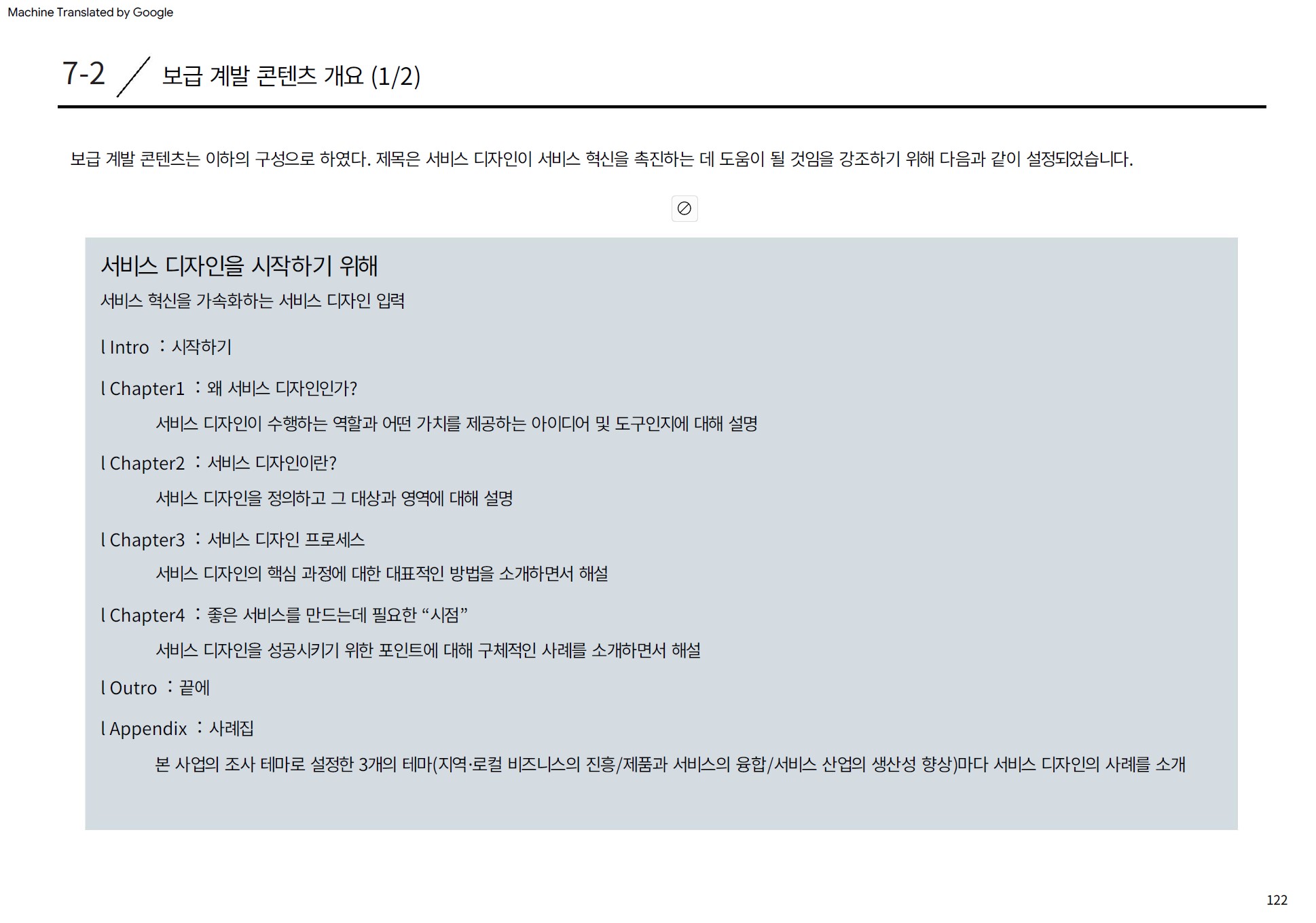 이 조사연구는 국내외 민간 영역의 서비스디자인 실천 사례 조사・분석, 전문가 연구회에서의 토론, 그리고 심포지엄 개최 등을 통해 일본에서의 서비스디자인의 효과적인 도입・실천의 방향을 제시하는 것을 목적으로 한 경제산업성 프로젝트입니다. 그 결과물로 아래와 같은 콘텐츠가 만들어졌습니다.