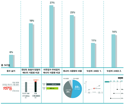 Red / Green컬러를 사용하여 평균보다 많이 사용하면 Red, 적게 사용하면 Green컬러로 나타냈으며, 곰캐릭터와 일러스트를 활용하여 부드럽고, 감성적인 느낌을 주었습니다. 누진세를 메인 콘셉트로, 전기 사용량과 사용료를 비교 분석하여 그래프로 보여주었습니다.