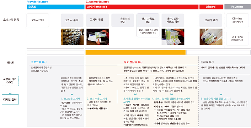 2011년 겨울, 건국 이래 최대의 에너지 사용률을 갱신하였다는 소식으로 아침 뉴스가 시작되는 것이 익숙하게 느껴질 만큼 에너지 문제가 전국적 이슈가 되고 있을 때였습니다. 1월 18일, 방송 3사 9시 뉴스에 에너지 고지서가 새롭게 바뀌어 시범 적용됨으로써 국민들의 에너지 절감 행동을 유도하게 될 수 있을 것으로 기대된다는 내용이 중요하게 보도되었었습니다. 이것은 국내에 서비스디자인의 사례가 소개된 최초의 사건이었습니다. 비록 서비스디자인 방법이 적용되었다고 소개된 것은 아니었지만 말이죠.