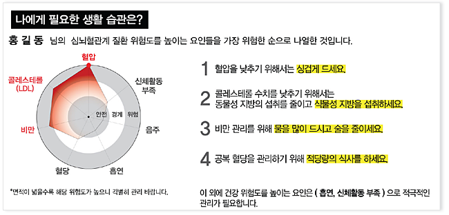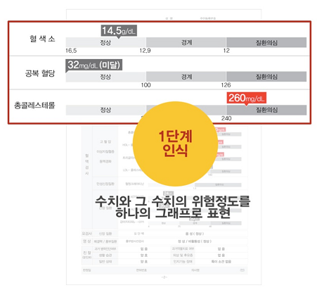 두 번째, 사람들이 결과표를 빠르고 쉽게 이해하게 하기 위해서는 먼저 결과서 안의 글을 최대한 쉽고 친절하게 바꾸어 주고 글과 그림을 적절히 조화시킴으로써 설명적인 그림으로 즉시 인지할 수 있도록 하고 글이 세부정보를 상호 보완하도록 하였다. 그리고 수검자의 검사별 수치가 기록된 부분에 대한 이해도가 가장 낮았는데, 현재는 (표 구조 파악 → 내 수치 확인 → 참고치 확인 → 내 수치와 참고치 비교 → 내 상태 결과 파악) 이러한 결과서 이해를 위해 5단계가 필요했다면, 다시 디자인된 결과서에서는 수치와 그 수치의 위험정도를 그래프에 한 번에 표현함으로써 이해의 단계를 한 단계로 줄였다. 이 부분은 수치표를 이해해야 하는 수검자와 이 수치표를 보고 상담을 해 주어야 하는 의료진 모두가 이해도에 있어 매우 만족했던 부분이었다.