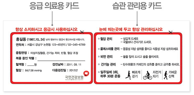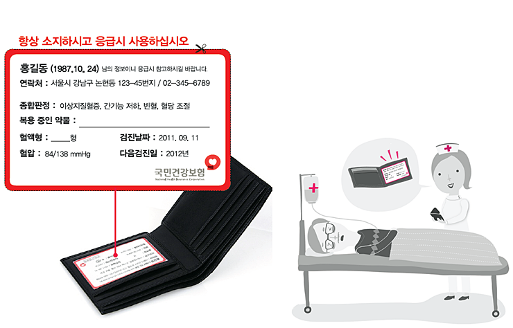 세 번째로, 수검자들이 ‘참여할 수 있게 하여 건강 검진에 대한 능동성을 높일 수 있도록 유도’하여 이 결과에 대해 능동적으로 받아들이게 하는 부분이다. 왼쪽 페이지에는 수검자들이 직접 잘라서 사용할 수 있는 ‘응급의료용 카드’와 ’ 습관 관리용 카드’가 있는데 응급의료용 카드는 잘라서 지갑에 소지하고 다니며, 응급한 상황에 처했을 때 의료진이 빠른 대처를 할 수 있도록 도와주는 것으로, 이 부분은 심뇌혈관계 질환이 응급상황에 처할 수 있는 질환이라는 것을 은연중에 드러내고 있다. 그리고 습관관리용 카드는 잘라서 냉장고에 붙이거나 식탁 유리에 넣어서 가족들과 공유하며, 항상 관리할 수 있도록 제안되었다.