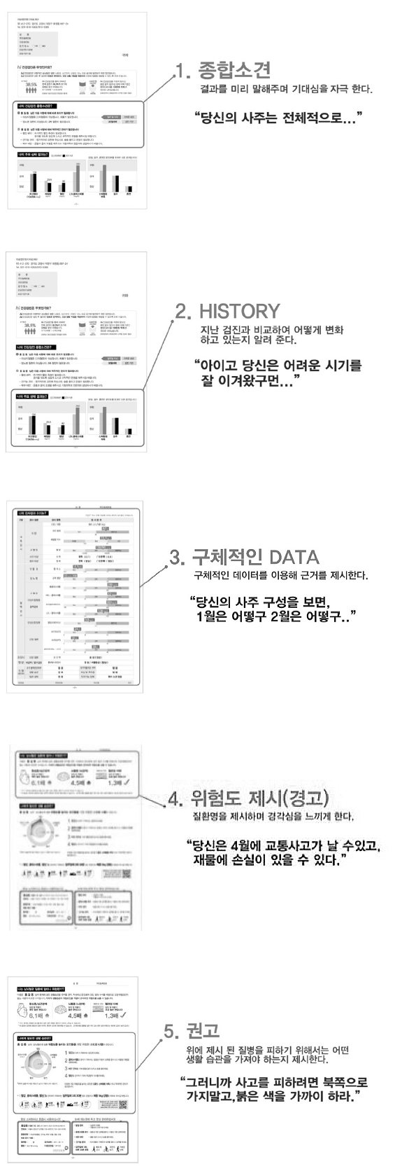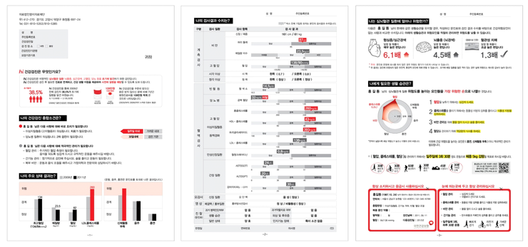 그래서 새로운 결과서에는 첫 장에 어디가 제일 안 좋은지 알 수 있는 종합 소견이 요약되어 있고, 두 번째 장에는 안 좋은 정도가 어느 정도인지 그 상세한 데이터가 기록되어 있으며 세 번째 장에는 이러한 상태를 회복하기 위해서는 어떠한 생활 습관을 가져야 하는지가 표시되도록 구성되어 있다. 그리고 전체적으로 빠르게 빨간색으로 강조된 부분만 훑어보더라도 핵심적인 정보를 습득할 수 있도록 구성하였다.