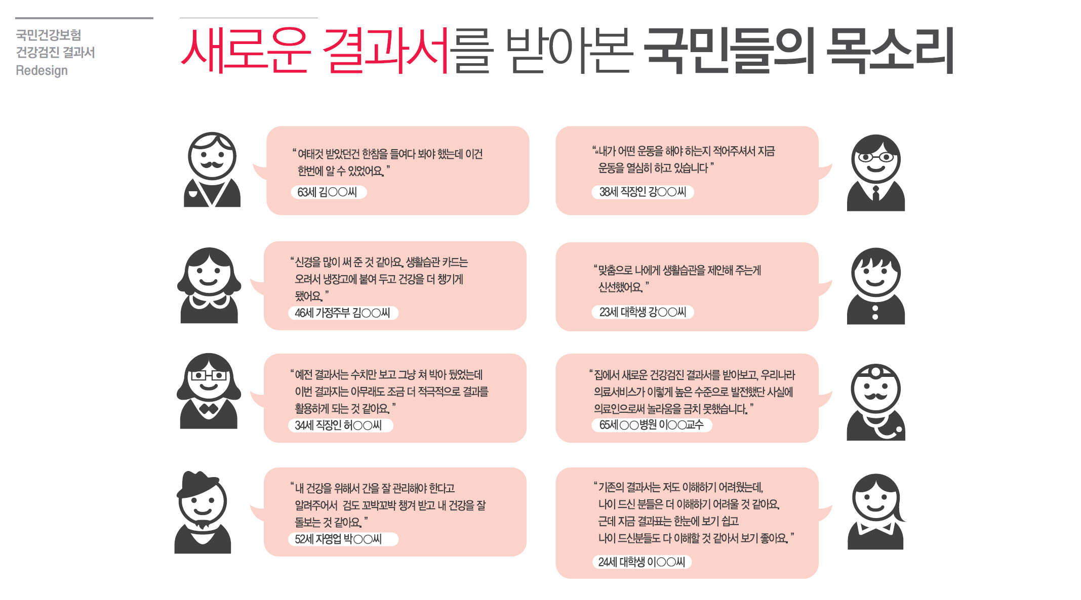 이해조차 하기 어려운 결과표를 받아 든 국민들은 결과서를 활용해야 한다는 생각 대신 그냥 가볍게 별 것 아닌 것으로 치부해 버리게 된다. 의료진과 전 국민, 이 두 집단 간에 풀기 어려운 커다란 소통의 문제가 존재하고 있는 것이다. 의료진과 전 국민이 함께 원활히 소통할 수 있게 하기 위해 다시 디자인되어야 하는 대상으로 결정되었던 것은 ‘건강검진 결과서’였다. 이 결과서는 건강검진이 수검자의 생활에 직접적인 영향을 미칠 수 있는 거의 유일한 매개체이기 때문이다.