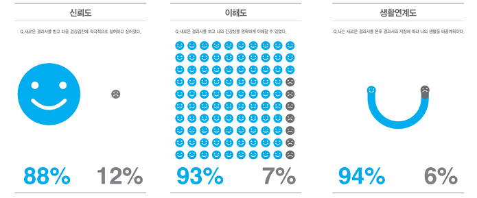 새로운 결과서를 본 후 “결과서의 지침에 따라 나의 생활습관을 바꿀 계획이다”라고 응답한 응답자가 94%에 달했으며, 응답자의 93%가 “새 결과서를 보니 나의 건강상태를 쉽고 명확하게 이해할 수 있었다”라는 의견을 보였다. 또한 “새로 디자인된 결과서를 받고 나서 다음 건강검진에 적극적으로 참여하고 싶어 졌다”는 대답이 응답자의 88%를 차지함으로써, 우리가 이 프로젝트로 달성하려 했던 건강검진에 대한 신뢰도와 관심, 결과에 대한 이해도, 생활 습관으로의 연계를 모두 향상하는 뚜렷한 효과를 볼 수 있었다.