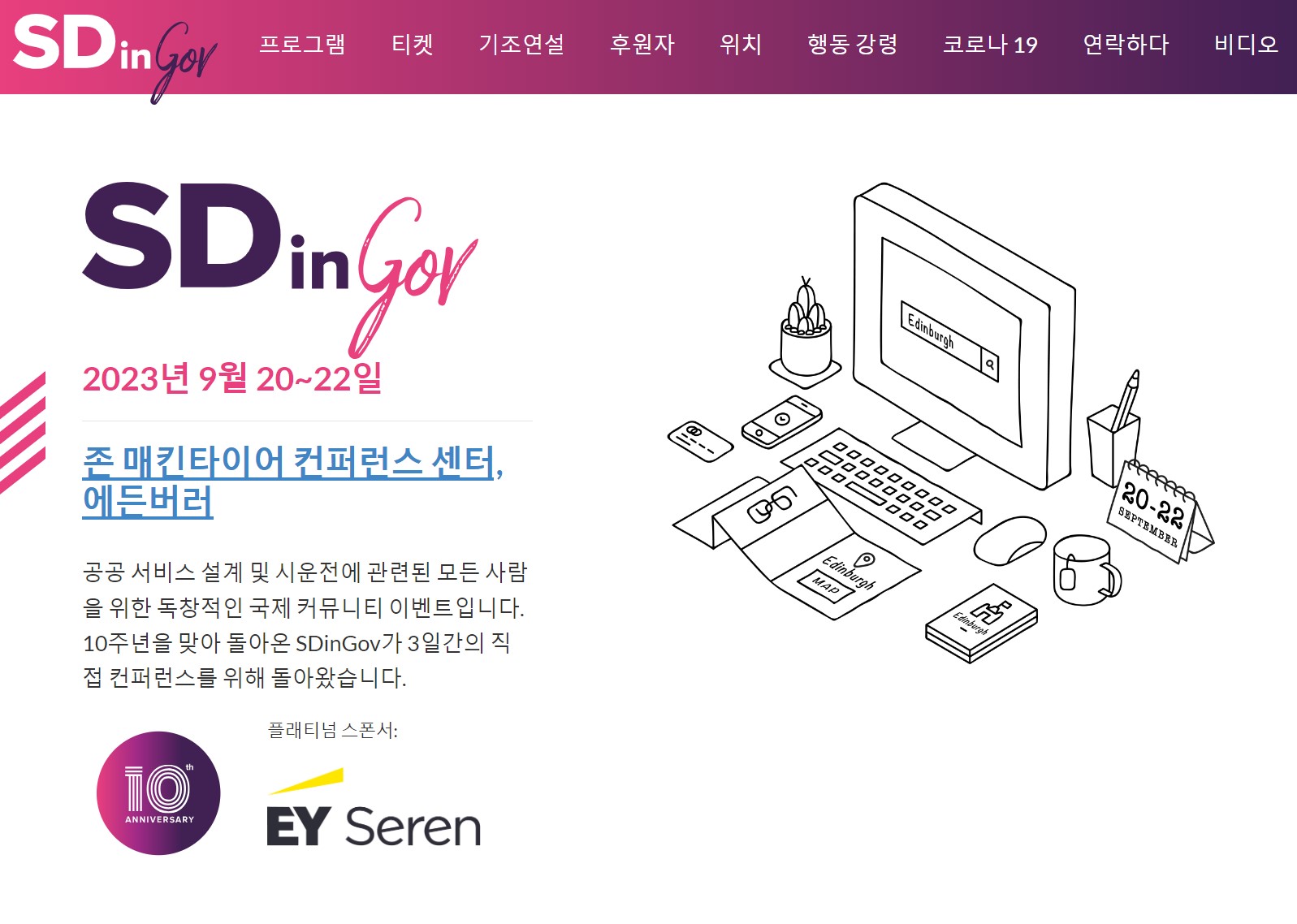 "SDinGov"는 공공 서비스 디자인과 관련된 국제 커뮤니티 이벤트입니다. 올해 10주년을 맞이하여 2023년 9월 20일부터 22일까지 3일간 오프라인 컨퍼런스를 개최합니다. 이 행사는 중앙 및 지방 정부 서비스, 건강 및 교육 서비스, 비상 서비스, 시민 기술 등을 관리, 디자인, 개발하는 사람들을 대상으로 합니다.