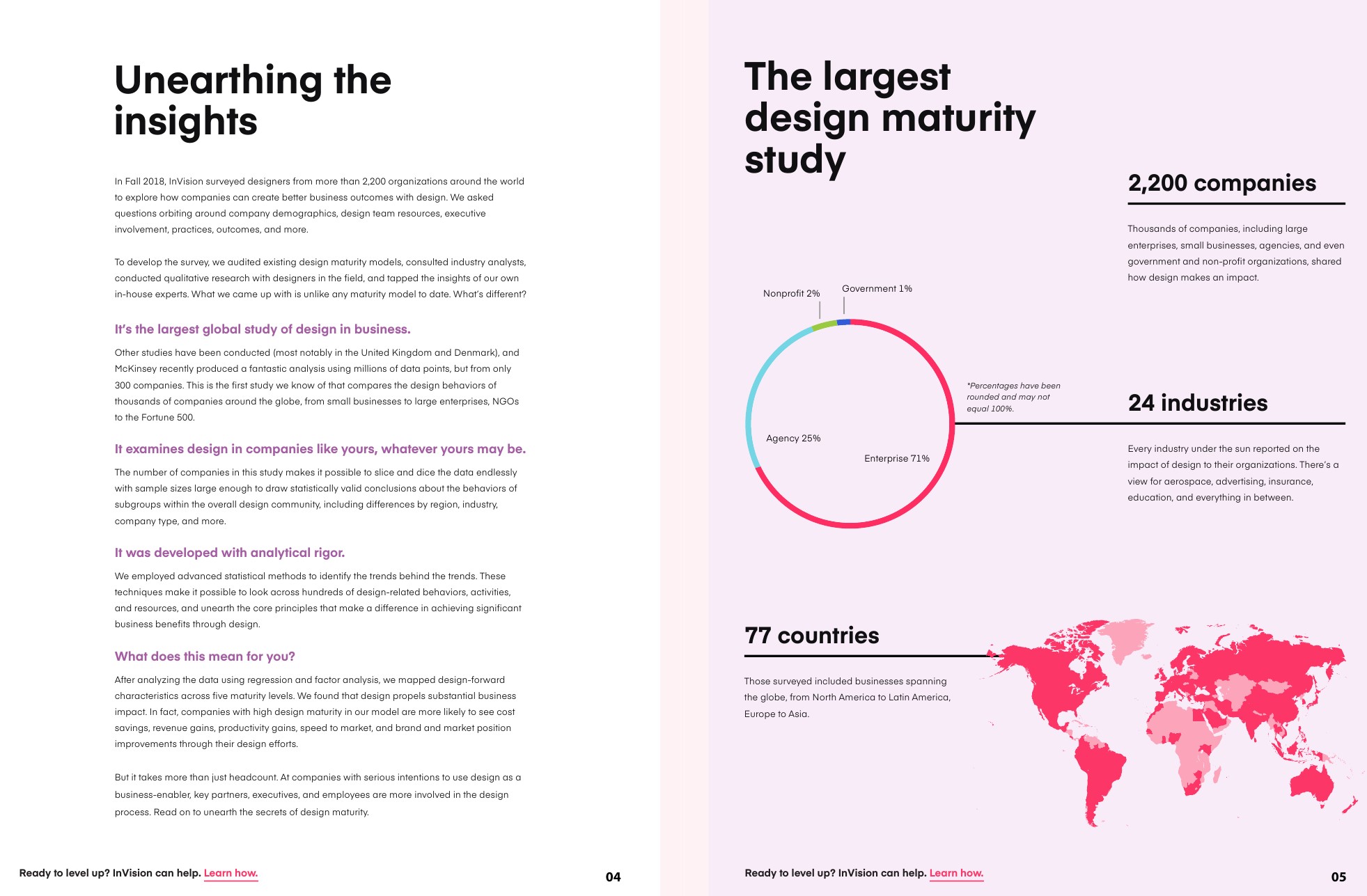 2018년 InVision은 전 세계 2,200개 이상의 조직에서 디자이너를 대상으로 설문조사를 실시하여 The New Design Frontier를 작성했다 . 이 보고서는 회사의 수익에 다양한 수준의 영향을 미치는 고성과 팀의 행동, 관행 및 결과를 탐구한다.