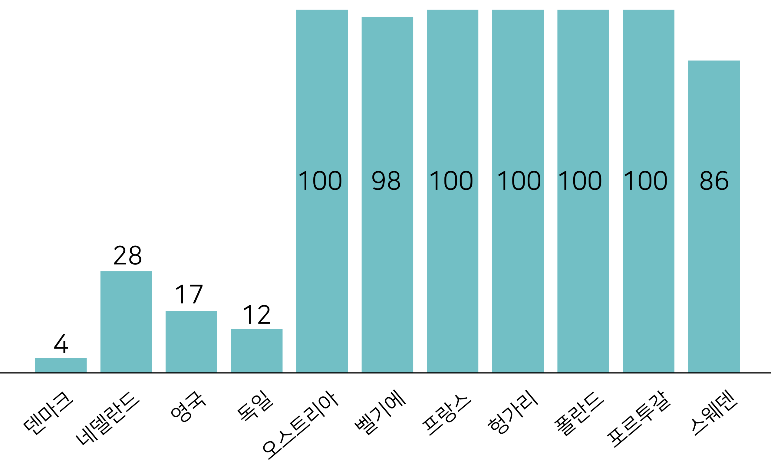이 그래프*는 국민들한테 장기 기증 의사를 물어본 결과다. 덴마크는 4%, 영국은 17%로 아주 낮은 반면 오스트리아, 프랑스 같은 나라들은 100%다. 장기기증 의사를 표명하는 시점은 면허시험을 볼 때다. 작성 서식에 장기기증 희망 여부를 묻는 항목이 있다.