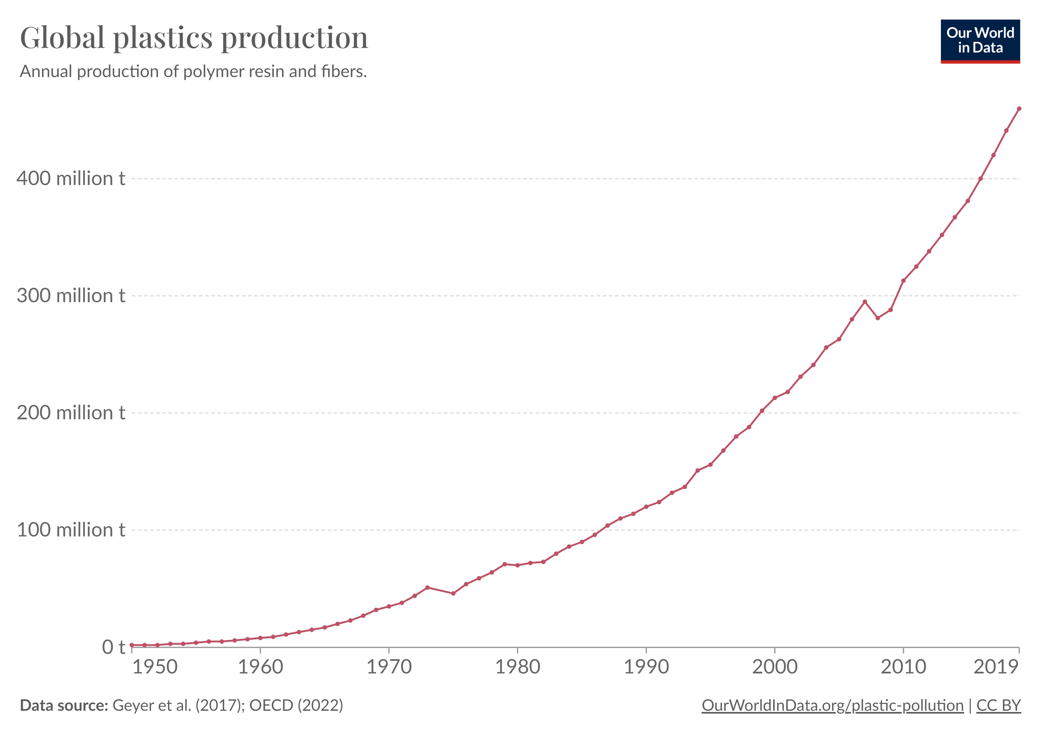 과학기술의 연구개발은 번영을 가져오는 동시에 때로는 환경 파괴와 자원 고갈이라는 부작용을 낳기도 한다. 매혹적이면서도 섬찟한 이중적 면모다. 대체로 기술 자체는 더 나은 세상을 위한 것이지만 풍요로움을 쫒는 인간의 끝없는 욕망이 기술을 지렛대 삼아 어두운 면을 들춰내면서 일을 망치곤 한다. 당구공 소재로 쓰이던 상아 수요가 늘면서 코끼리가 멸종에 이를 지경이 되자 이를 막아야 한다는 취지에서 연구개발이 시작되어 개발된 플라스틱은, 그 유용함이 확인되면서 매년 사용량이 늘어 2021년 기준 한 해 약 4억만 톤이 생산(그림)되었고 지구는 수용 한계에 도달해가고 있다. 선한 의도에서 연구개발이 시작되었지만 인간의 끝없는 욕망이 선한 의도를 잠식하고 환경에 피해를 미치는 결과를 가져온 셈이다.