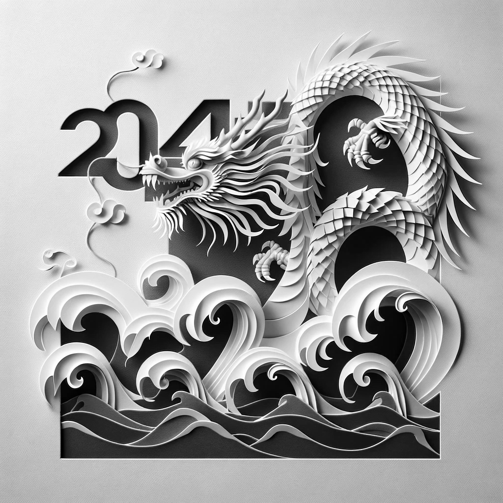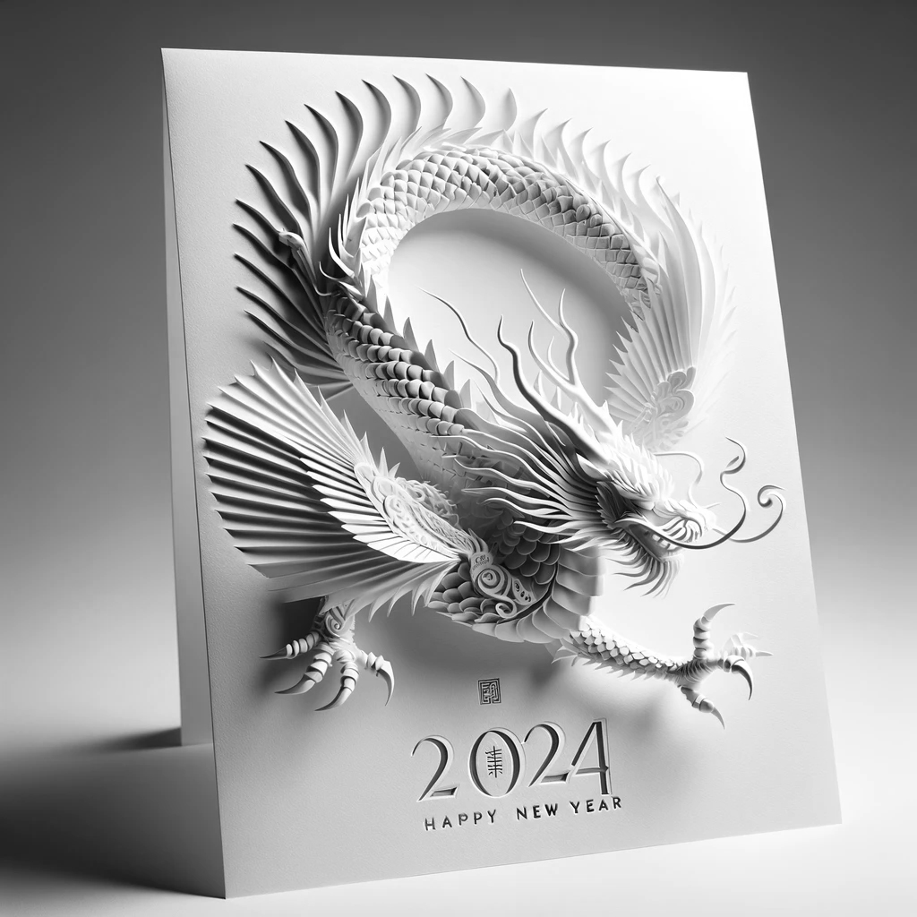 '2024년을 맞이하는 신년 축하 카드로, 흰색의 종이에 정교하게 표현된 페이퍼 아트 스타일로 역동적인 모습의 용이 담겨 있다.