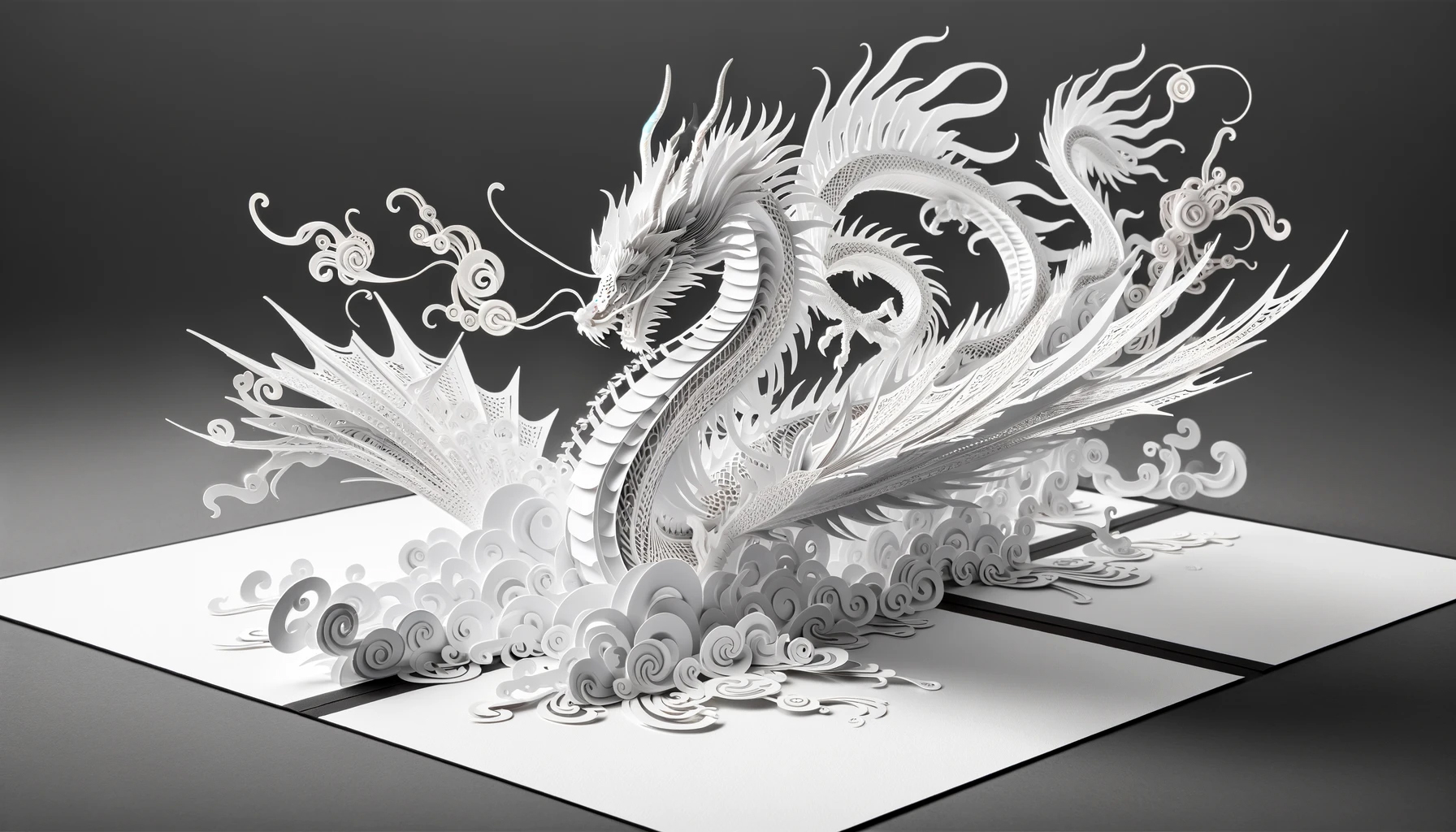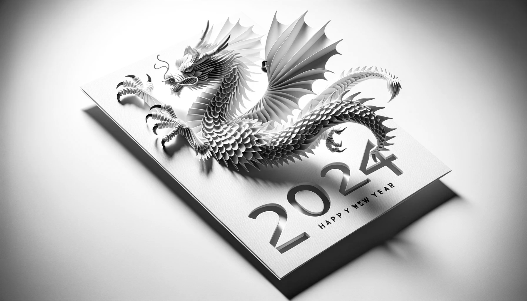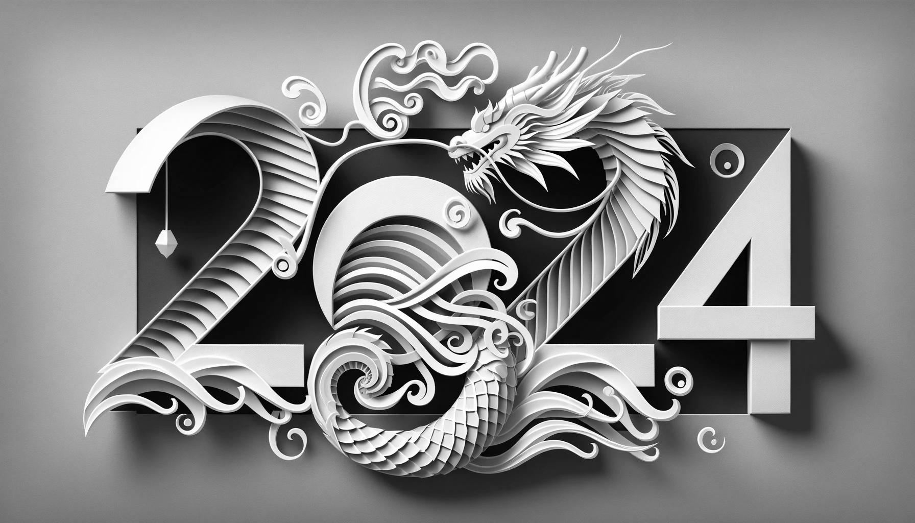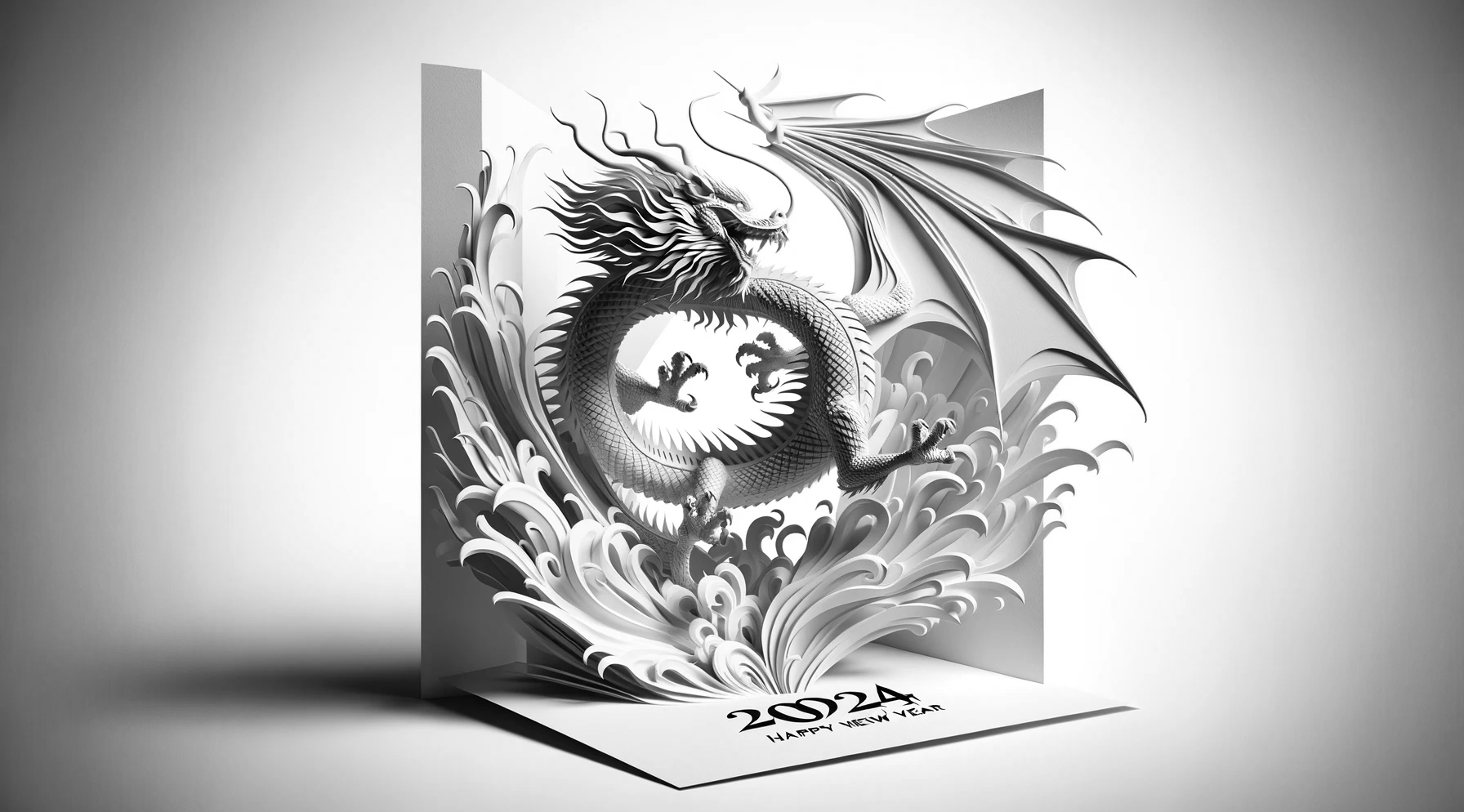 '2024년을 맞이하는 넓은 형식의 고해상도 신년 축하 카드로, 페이퍼 아트 스타일로 디자인된 힘차고 우아한 용이 특징이다. 용의 몸과 꼬리가 2024년도의 숫자와 예술적으로 통합되어, 타이포그래피와 일러스트레이션의 조화로운 혼합을 만들어낸다. 비늘에서 수염에 이르기까지 용의 각 요소는 정밀하게 묘사되어, 페이퍼 아트의 질감과 깊이를 전달한다. 배경은 부드러운 그라데이션으로, 용이 카드에서 튀어나올 듯한 생동감을 주는 그림자를 만들어낸다. 전체적인 디자인은 단색으로, 세부사항과 입체 효과를 강조하기 위해 빛과 그림자의 상호작용에 중점을 둔다.'