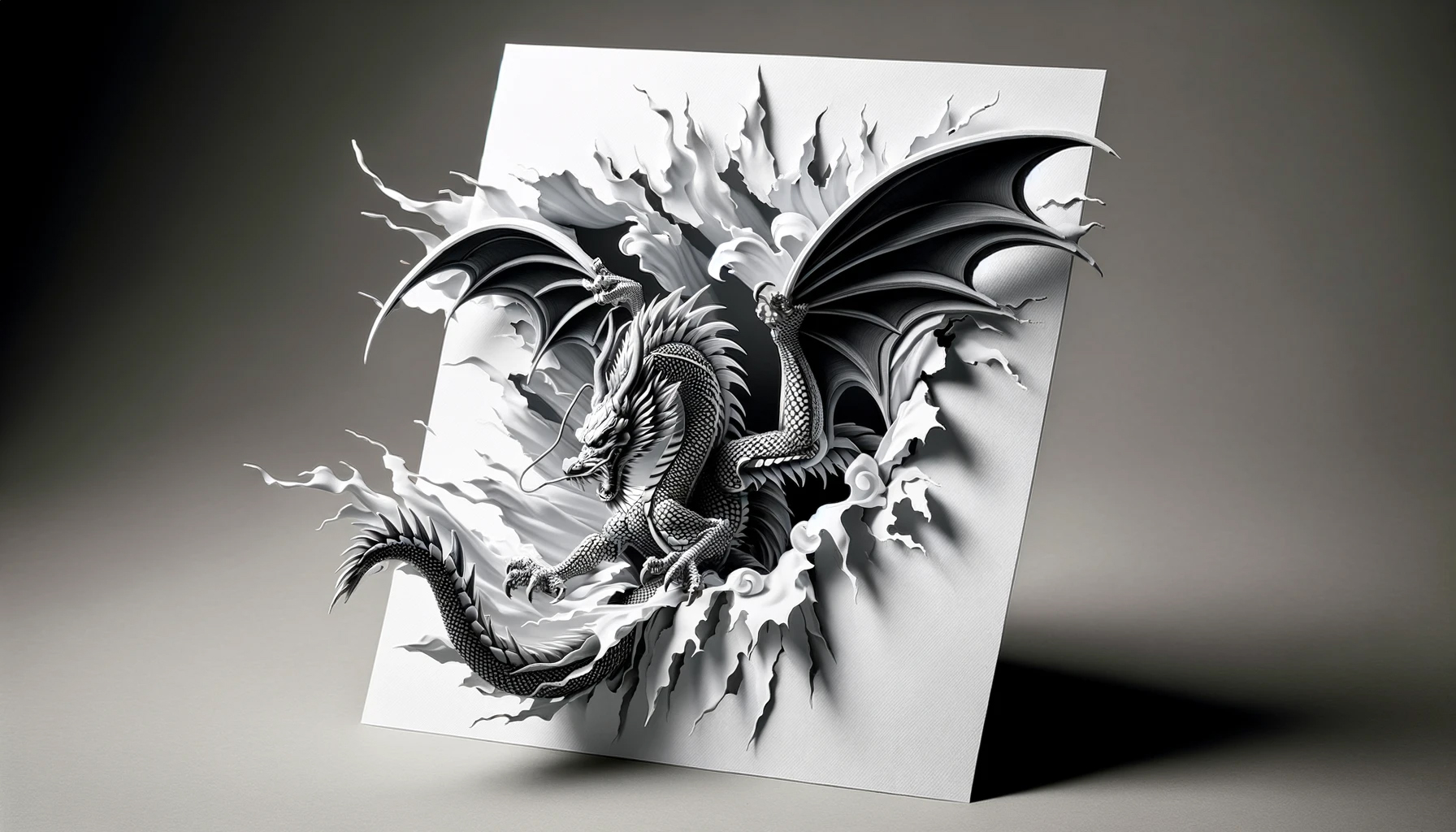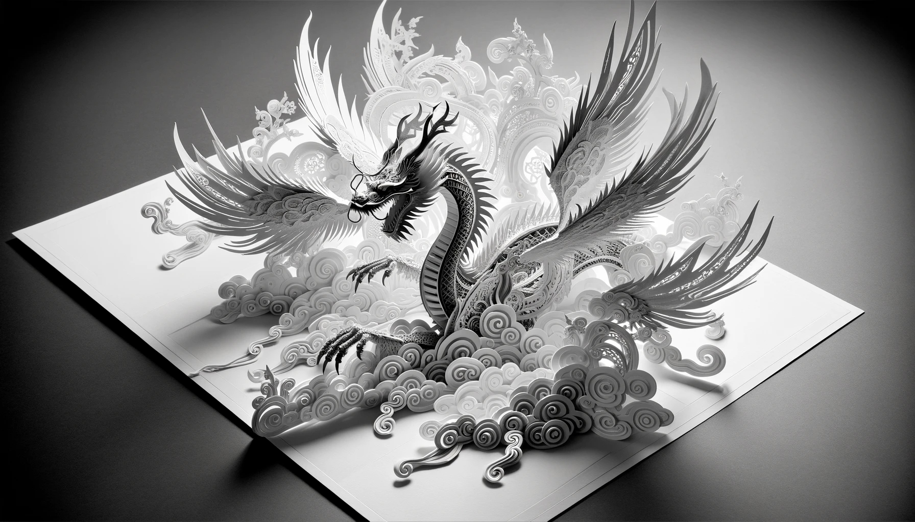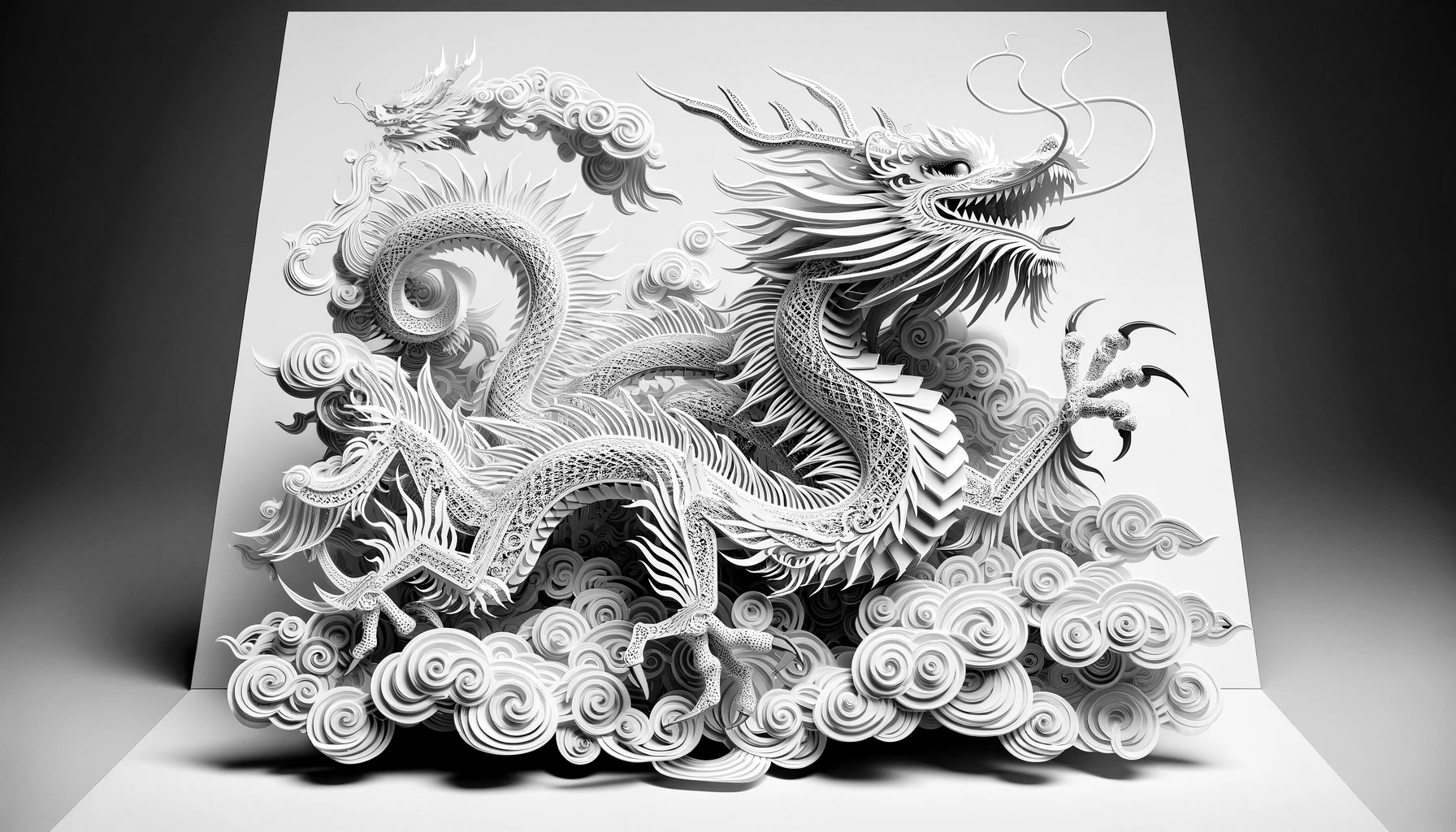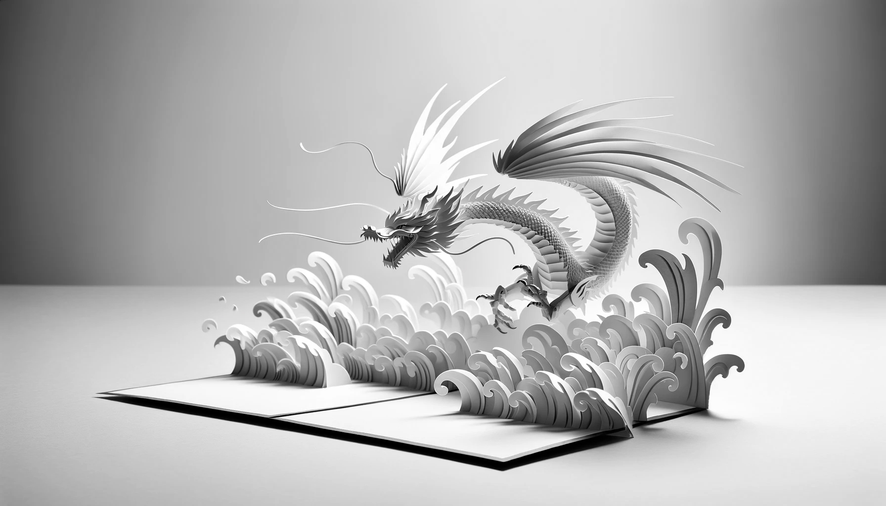 '2024년을 맞이하는 넓은 형식의 고해상도 신년 축하 카드로, 페이퍼 아트 스타일로 디자인된 힘차고 우아한 용이 특징이다. 용의 몸과 꼬리가 2024년도의 숫자와 예술적으로 통합되어, 타이포그래피와 일러스트레이션의 조화로운 혼합을 만들어낸다. 비늘에서 수염에 이르기까지 용의 각 요소는 정밀하게 묘사되어, 페이퍼 아트의 질감과 깊이를 전달한다. 배경은 부드러운 그라데이션으로, 용이 카드에서 튀어나올 듯한 생동감을 주는 그림자를 만들어낸다. 전체적인 디자인은 단색으로, 세부사항과 입체 효과를 강조하기 위해 빛과 그림자의 상호작용에 중점을 둔다.'