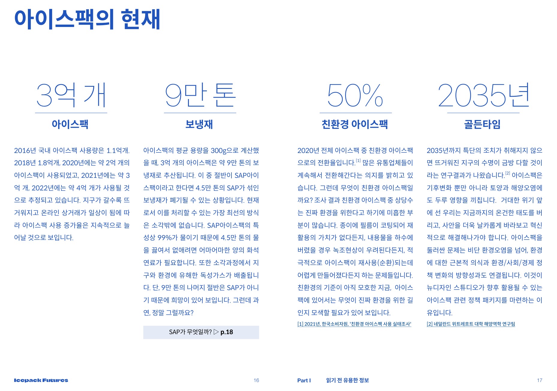 울산과학기술원(UNIST) 디자인학과 뉴디자인 스튜디오의 독립 프로젝트, Icepack futures는 아이스팩의 지속가능한 미래에 대한 고민으로부터 출발했습니다. 현재 아이스팩의 생산은 지속적으로 늘어나고 있으며, 올해는 그 생산량이 3억 개에 달할 것으로 예측됩니다. 그중에는 재활용 및 폐기가 상당히 어려운 SAP 아이스팩이 다수 포함되어 있어 심각한 환경문 제를 초래하고 있습니다. 아무런 변화가 없다면, 머지않은 미래에 우리는 훨씬 더 많은 문제들을 직면하게 될 것입니다.