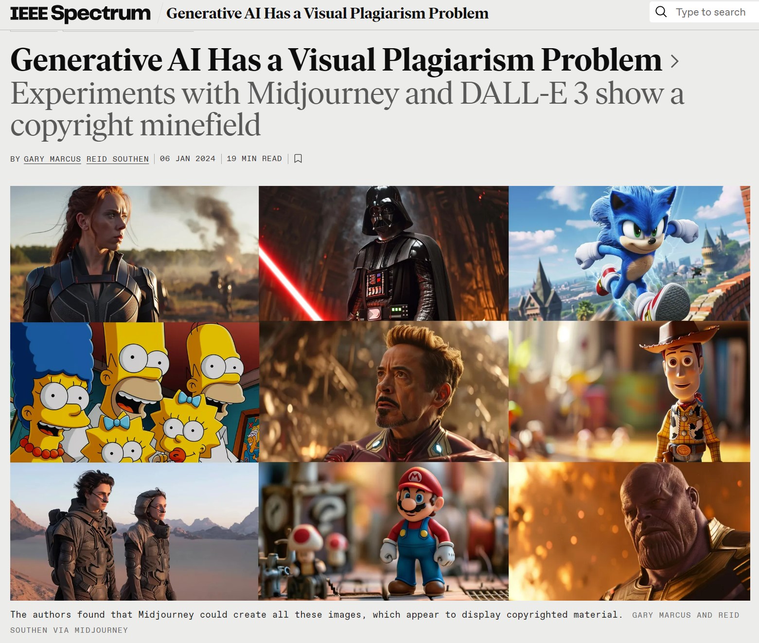 원문 출처 : Generative AI Has a Visual Plagiarism Problem. Experiments with Midjourney and DALL-E 3 show a copyright minefieldGARY MARCUSREID SOUTHEN06 JAN 2024. ieee.org
