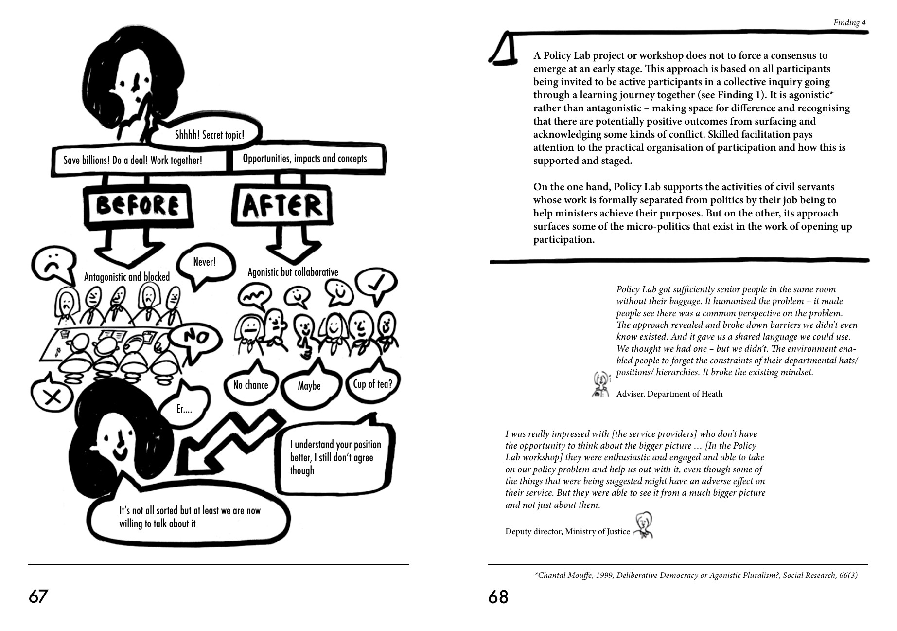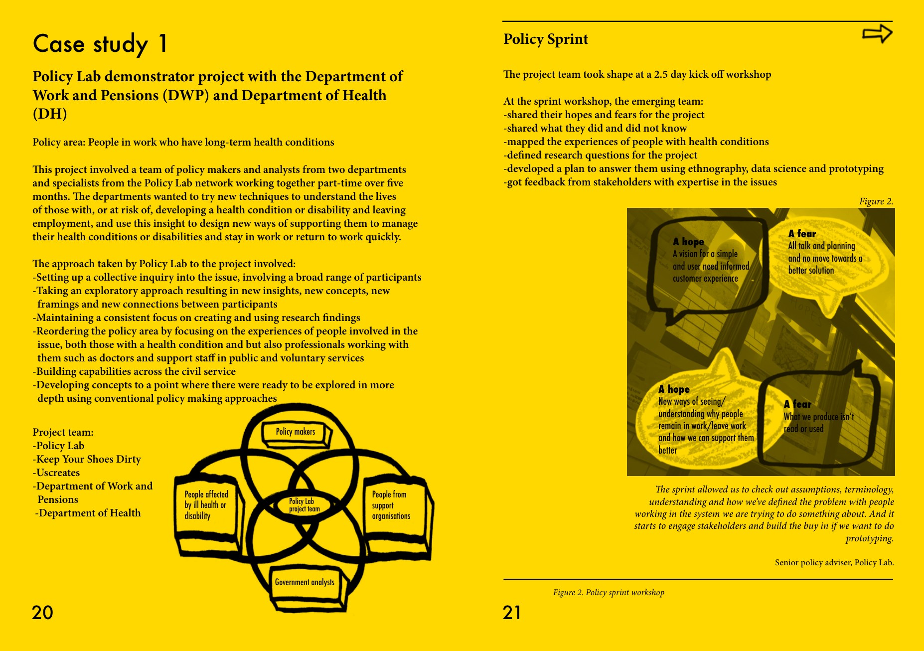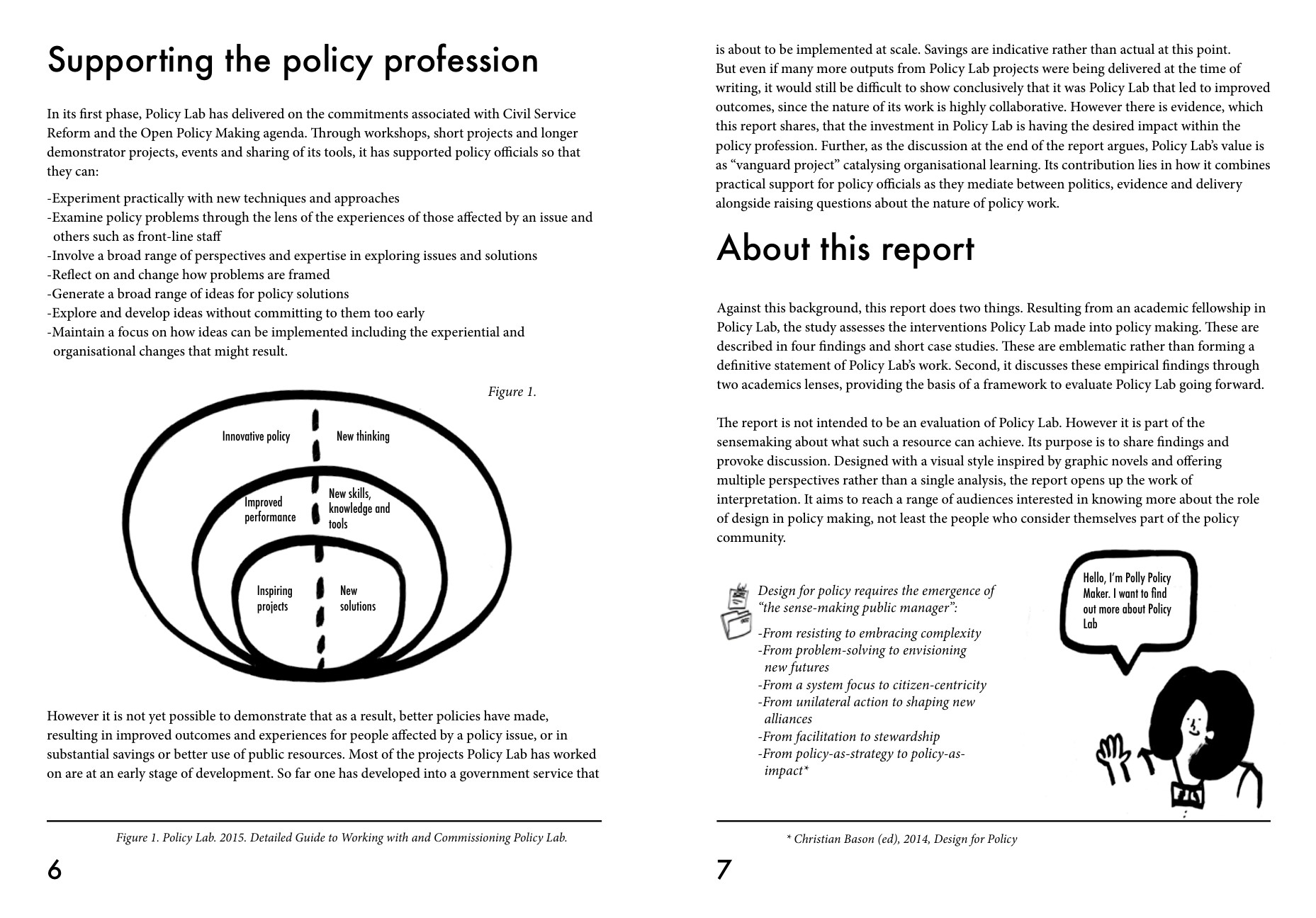 이 보고서는 2014~15년 영국 정부 혁신팀인 폴리시랩에 소속되어 있던 루시 킴벨 Lucy Kimbell이 AHRC 펠로우십을 통해 작성한 공개용 보고서로 디자인 접근법이 정책 결정 과정에 미치는 영향을 탐구하며, 영국 정책 연구소(Policy Lab)의 사례를 중심으로 정책 개발에 있어 혁신적인 접근 방법을 제시한다.