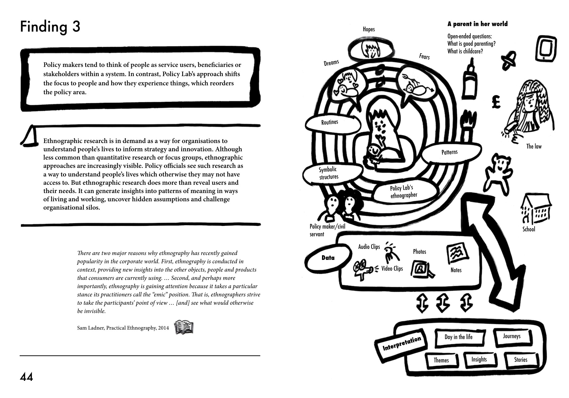 영국 정부 캐비닛오피스Cabinet Office(우리나라로 치자면 국무조정실이나 행정안전부와 유사 역할)에 소속된 폴리시랩'Policy Lab'에 대한 1년 간의 연구 결과를 바탕으로 Policy Lab이 정책 결정 과정에 디자인 기반 접근법을 적용하는 방법과 그 영향을 탐구한다. Policy Lab이 정책 기획과 운영에 어떻게 디자인 방법을 활용하는지를 소개하고 있다.