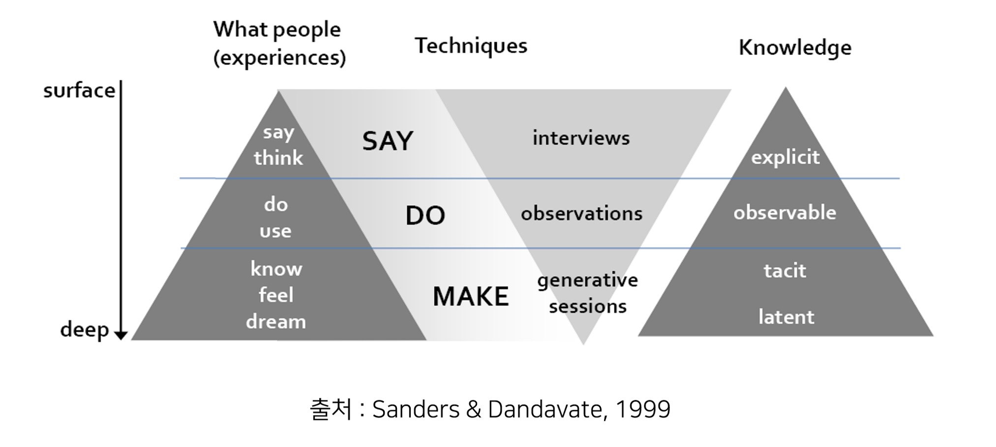 3) 가장 심층적인 사람의 욕구를 알아내기 위해서는 같이 뭔가를 만들어 보는, 공동 창작 워크숍 등의 활동을 통해 알 수 있다는 것이고요.