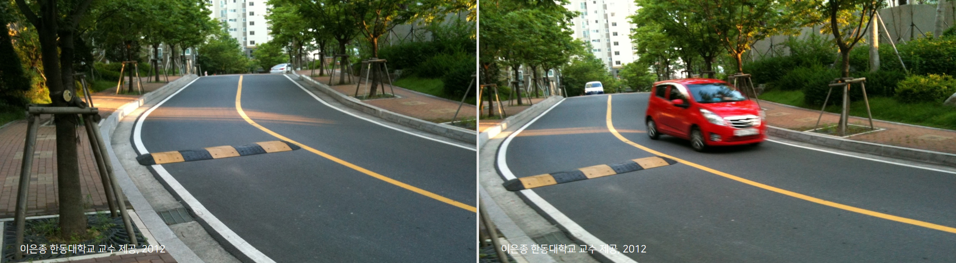여기는 아파트 단지 내 도로입니다. 길이 굽어 있고 앞에 과속 방지턱이 생긴 걸로 봐서 사고가 빈번히 났던 것 같습니다. 과속방지턱으로 인해서 사고가 줄었을까요? 오히려 사고가 더 많이 났습니다. 차들이 과속방지턱을 피해서 가느라 사고가 났던 것이죠. 이것은 공급자 중심의 정책 설계가 가져올 수 있는 위험성을 상징하는 사례라고 할 수 있습니다.