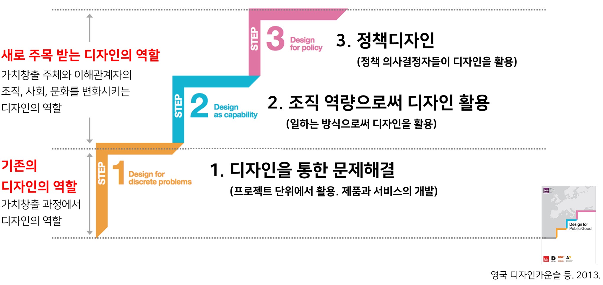 영국에도 한국디자인진흥원과 같이 디자인 진흥을 목적으로 하는 기관인 디자인카운슬이 있습니다. 이것은 10년 전 디자인카운슬이 발표한 보고서로, 당시 기준으로 세계의 주목할 만한 디자인 프로젝트들을 분류해 보니 1단계부터 3단계까지 나누어진다고 말하고 있습니다.
