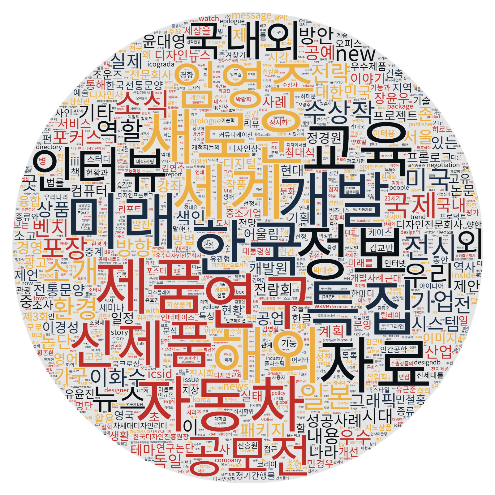 디자인 관련 정기간행물(디자인포장, 산업디자인, designdb, designdb+, K-design)의 전체 목차로 만든 워드클라우드 이미지. 많이 다루어졌던 키워드들을 짐작해 볼 수 있다.