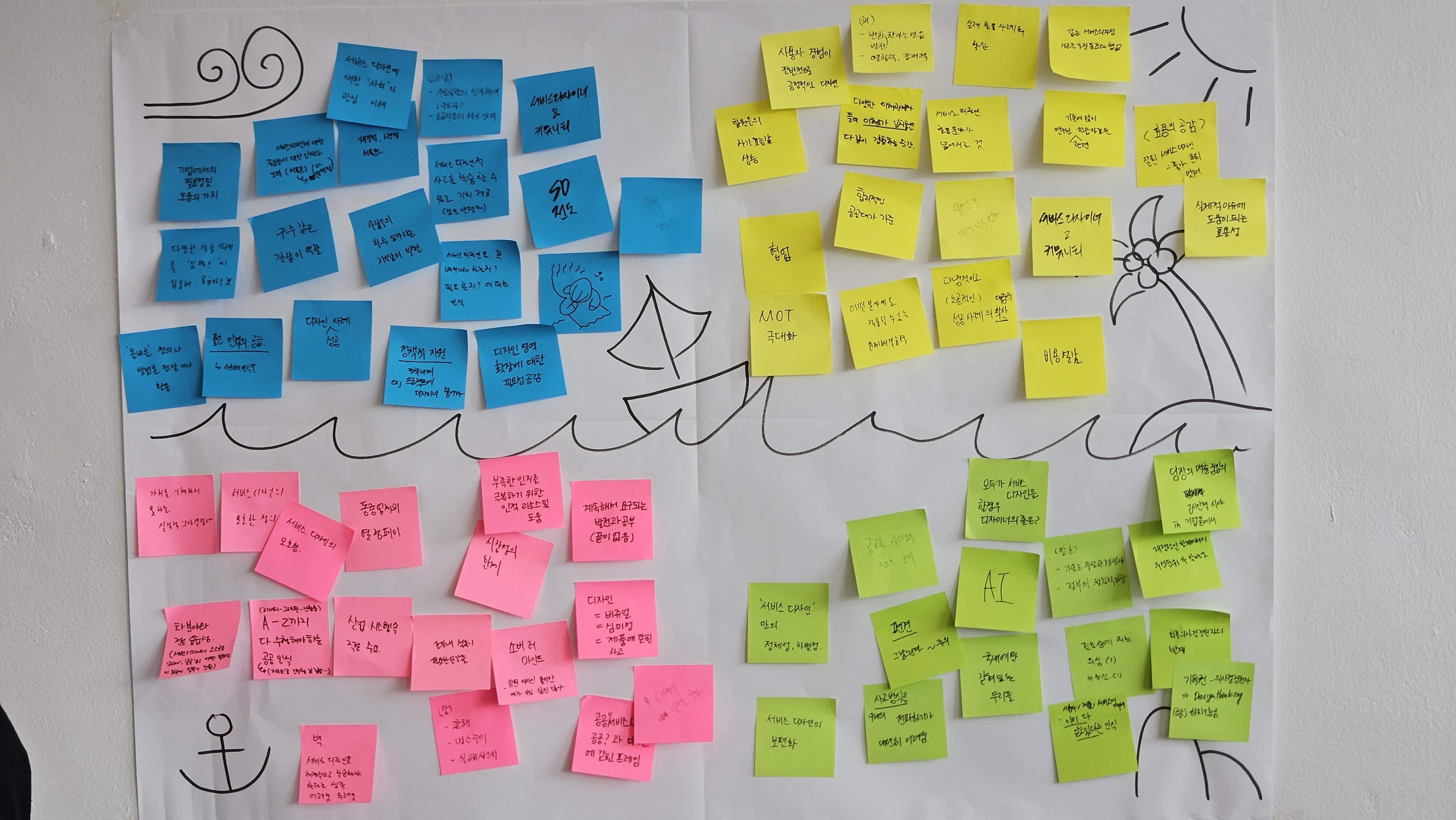 이 워크숍은 서비스디자인드링크 운영자 손민정, 정영국, 전연주 등이 참석한 자리였고 참가자들은 세일보트 회고 기법*을 활용해서 각자의 의견을 '해', '바람', '닻', '암초' 항목으로 나누어 포스트잇에 작성하고 공유하는 시간을 가졌습니다.