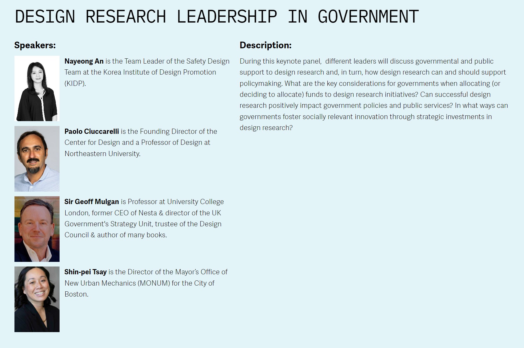 이 기조 패널에서는 다양한 리더들이 디자인 연구에 대한 정부 및 공공의 지원과 디자인 연구가 정책 결정을 어떻게 지원할 수 있고 또 지원해야 하는지에 대해 논의합니다. 정부가 디자인 연구 이니셔티브에 자금을 할당하거나 할당하기로 결정할 때 고려해야 할 주요 사항은 무엇일까요? 성공적인 디자인 연구가 정부 정책과 공공 서비스에 긍정적인 영향을 미칠 수 있나요? 정부는 어떤 방식으로 디자인 연구에 대한 전략적 투자를 통해 사회적으로 의미 있는 혁신을 촉진할 수 있나요?