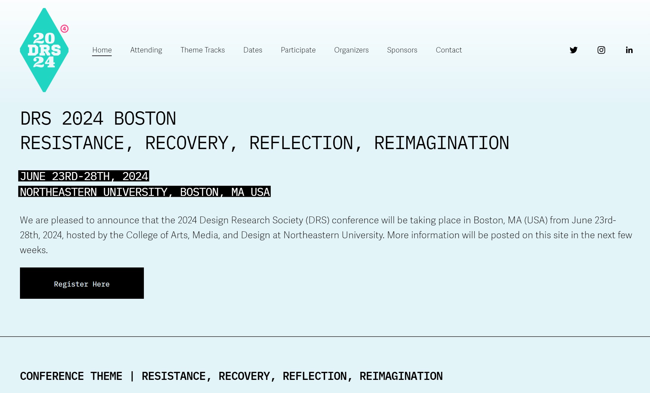2024년 디자인 연구 학회(DRS) 컨퍼런스가 2024년 6월 23일부터 28일까지 미국 매사추세츠주 보스턴에서 노스이스턴 대학교 예술, 미디어 및 디자인 대학 주최로 개최됩니다.