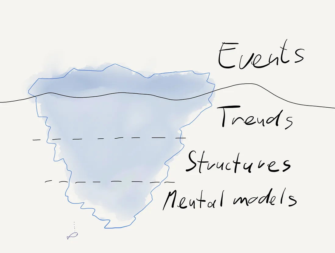 다행히도 '빙산 모델', 또는 '이해의 수준'(8페이지)이라고 불리는 시스템적 사고 접근법이 이 모호함을 해결해 줄 수 있습니다. 이 모델은 모든 것을 네 가지 수준에서 살펴보는 방법을 제시합니다: