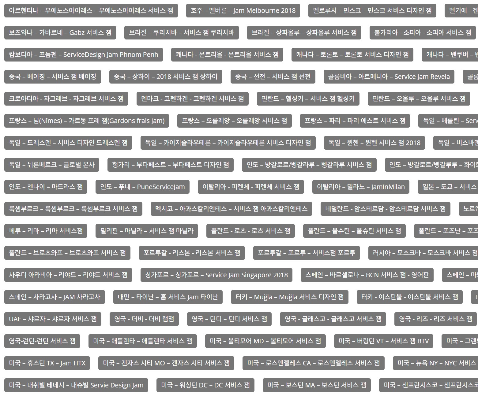 현재 Global Service Jam, Global Sustainability Jam, Global GovJam 이렇게 3가지 주제로 분화되어 운영되고 있다.