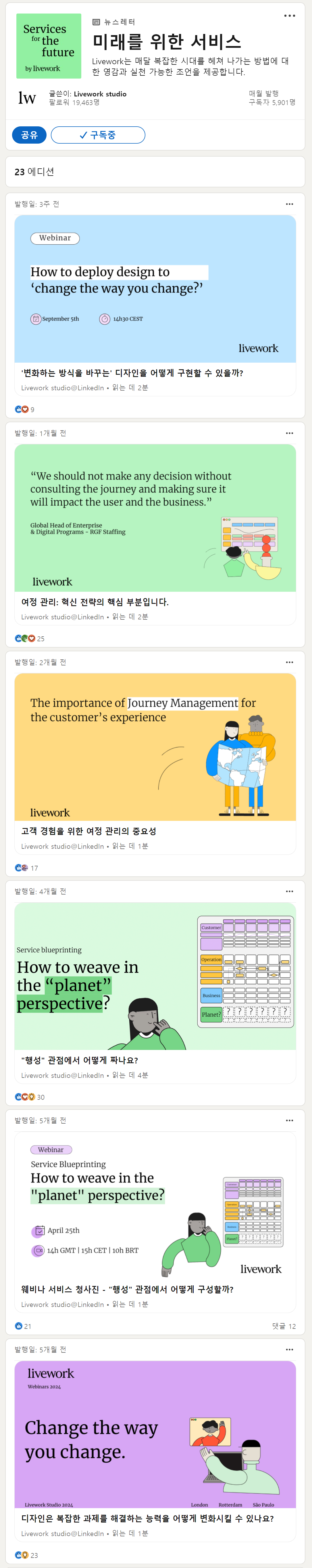 최근의 글 주제를 보면, 디자인을 조직의 변화 촉진 도구로 활용하는 방법, 여정 관리가 고객 경험 및 조직 변혁에 미치는 영향, 지속 가능성 및 환경적 관점을 서비스디자인에 통합하는 방법 등을 다루고 있다. 각 글은 실무적인 통찰을 제공하며, 디자인이 복잡한 문제 해결에서 중요한 역할을 한다는 메시지를 강조한다. 이는 Livework가 디자인을 도구로 삼아 조직 내부뿐만 아니라 외부 생태계와의 조화로운 상호작용을 목표로 한다는 것을 의미한다. 특히 고객 중심의 접근 방식과 지속 가능성을 중요한 가치로 내세우며, 이를 통해 조직이 변화에 잘 적응할 수 있도록 돕는 것이 목표임을 알 수 있다.