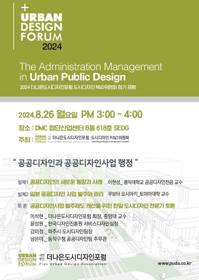 공공디자인사업 발주제도 개선을 위한 한일 도시디자인 전문가 좌담회. 2024.8.26.(월) 15:00~ . DMC첨단산업센터(SEDG)
