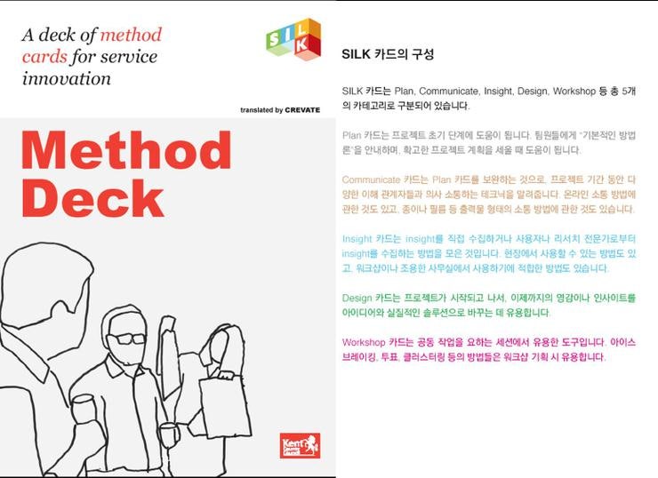서비스디자인 프로젝트를 진행하면서 “서비스디자인! 좋은 건 알겠는데 어디서부터 어떻게 시작해야 할지 모르겠어요.” 라고 고민하는 분들을 많이 만났습니다. 이에 크리베이트에서는 두 번째 CCL 프로젝트로 영국의 SILK(Social Innovation Lab for Kent)팀과 협조 아래 서비스디자인 Method Deck을 국내에 소개하게 되었습니다. 이 카드는 서비스디자인과 관련된 다양한 방법론을 모아서 정리한 것으로, 실제로 프로젝트를 진행 시 활용하기 편리하게 구성되어 있습니다. 보다 많은 분들이 SILK카드를 통해 서비스 디자인과 관련된 다양한 방법론들을 경험하시길 희망합니다. 또한, 프로젝트를 진행하는 데 있어 실질적인 도움을 받으셨으면 하는 바람입니다.