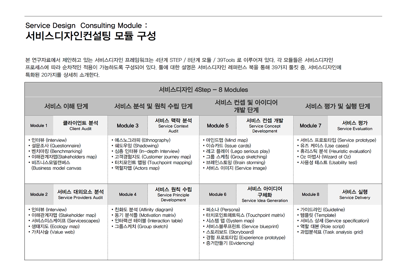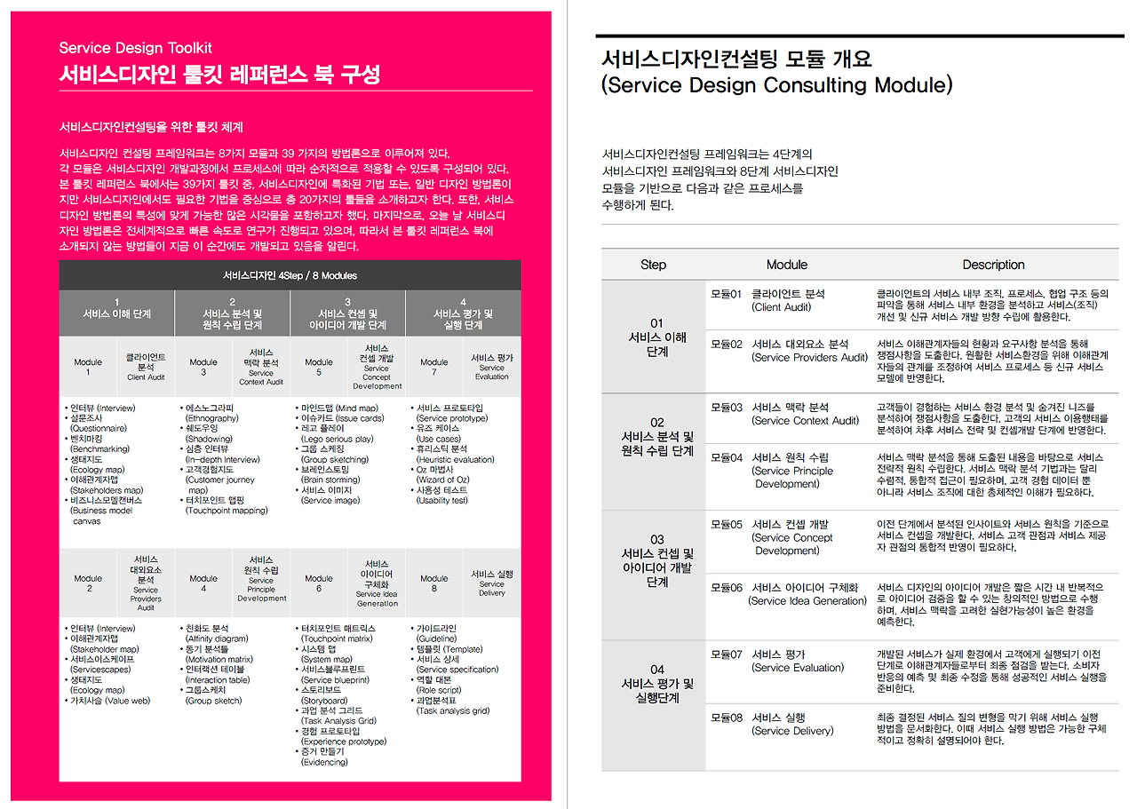 서비스디자인 프레임의 단계별 특성에 적합한 서비스디자인 모듈과 예시를 기술하며, 서비스디자인 컨설팅 프로젝트를 수행하는데 있어 기초자료로서의 활용을 목적으로 한다.