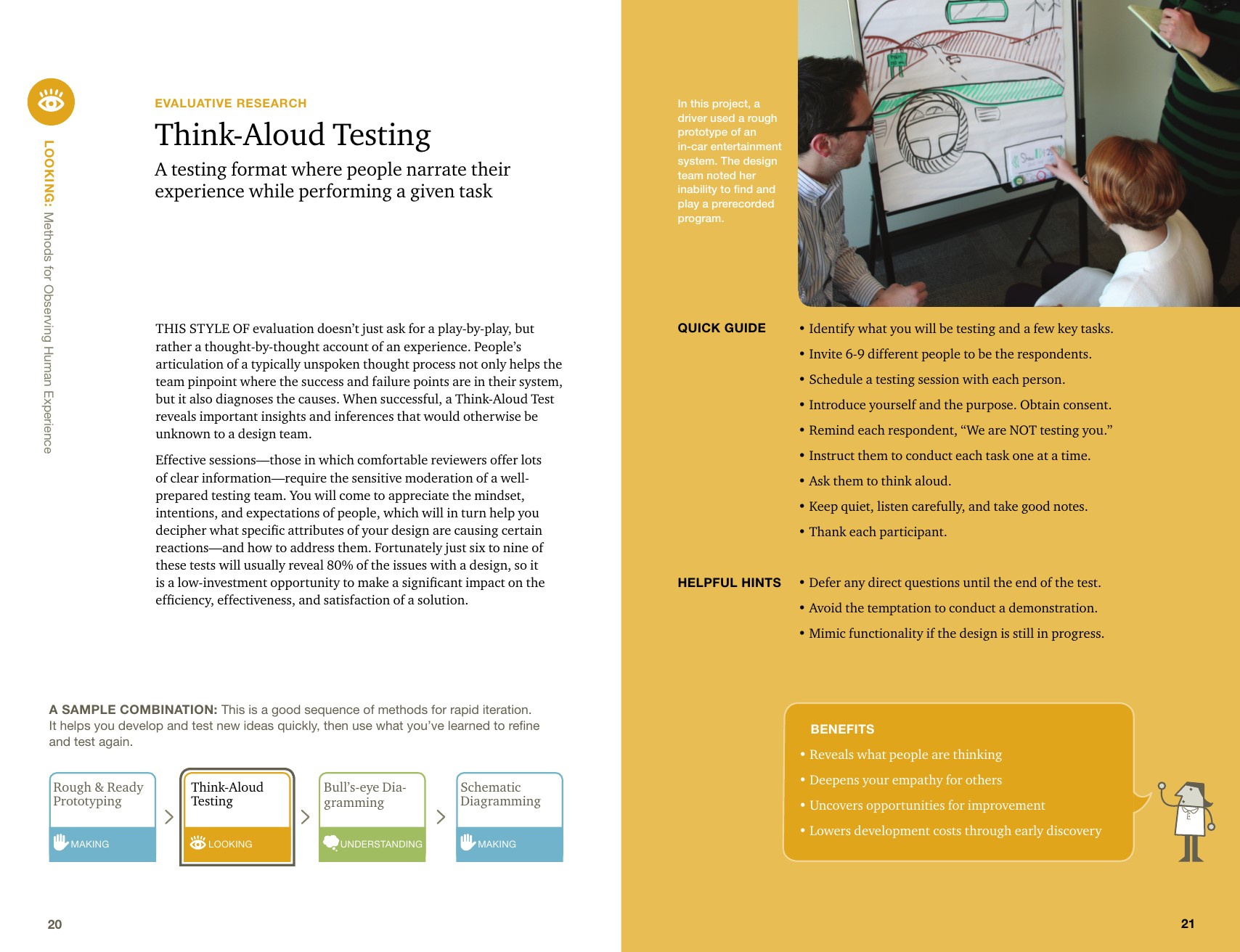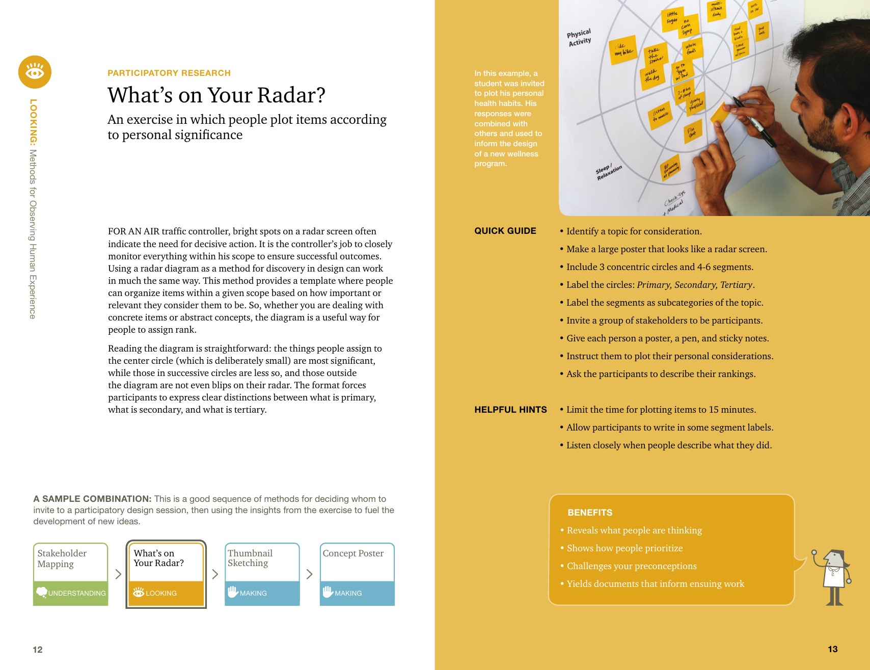 36개의 디자인 방법론: 브레인스토밍, 사용자 인터뷰, 서비스 블루프린트, 페르소나 개발 등의 구체적인 방법론이 포함되어 있다. 방법들은 관찰(Watching), 이해(Understanding), 제작(Making)이라는 세 가지 주제로 구분되어 있다.
