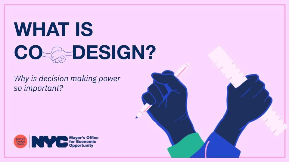 뉴욕시 공무원으로서 공동 디자인을 당신의 업무에 도입하고 싶다면, 우리와 연락해 지원을 요청할 수 있다. 뉴욕시장실 경제기회국의 서비스디자인스튜디오에서 열린 사무시간을 예약하고, 상담을 받아보라. (뉴욕시 공무원 대상!)