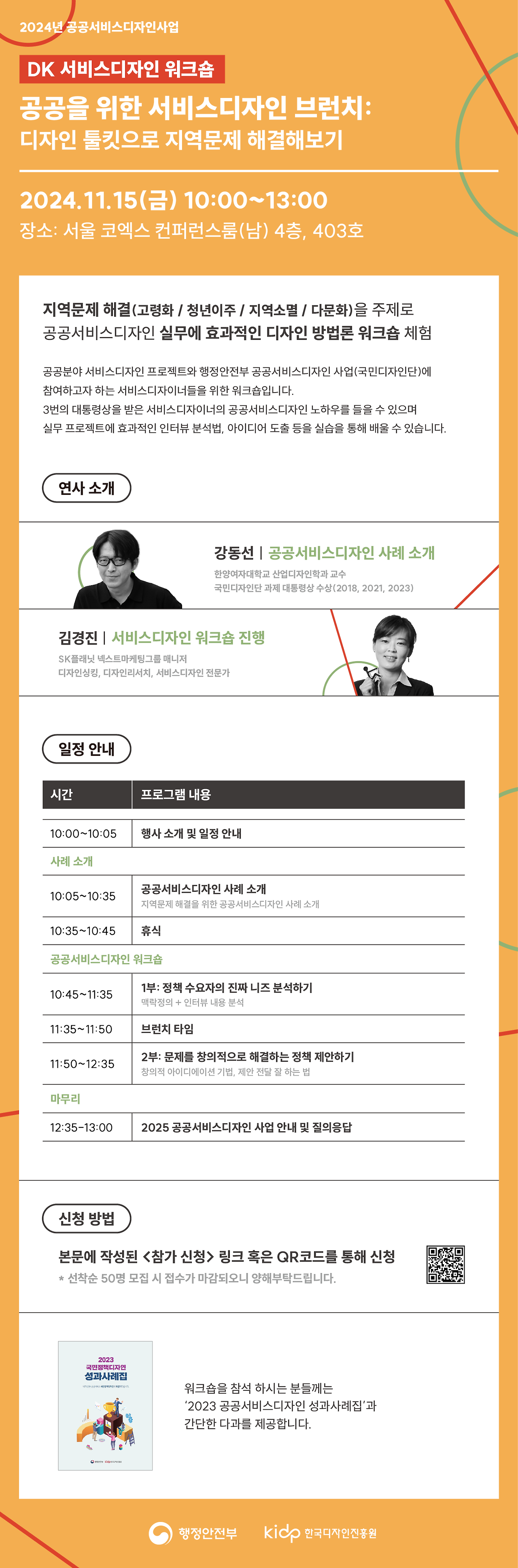 공공을 위한 서비스디자인 브런치: 디자인 툴킷으로 지역문제 해결해보기 워크숍 개최 안내 - 11.15(금) 10:00, 코엑스