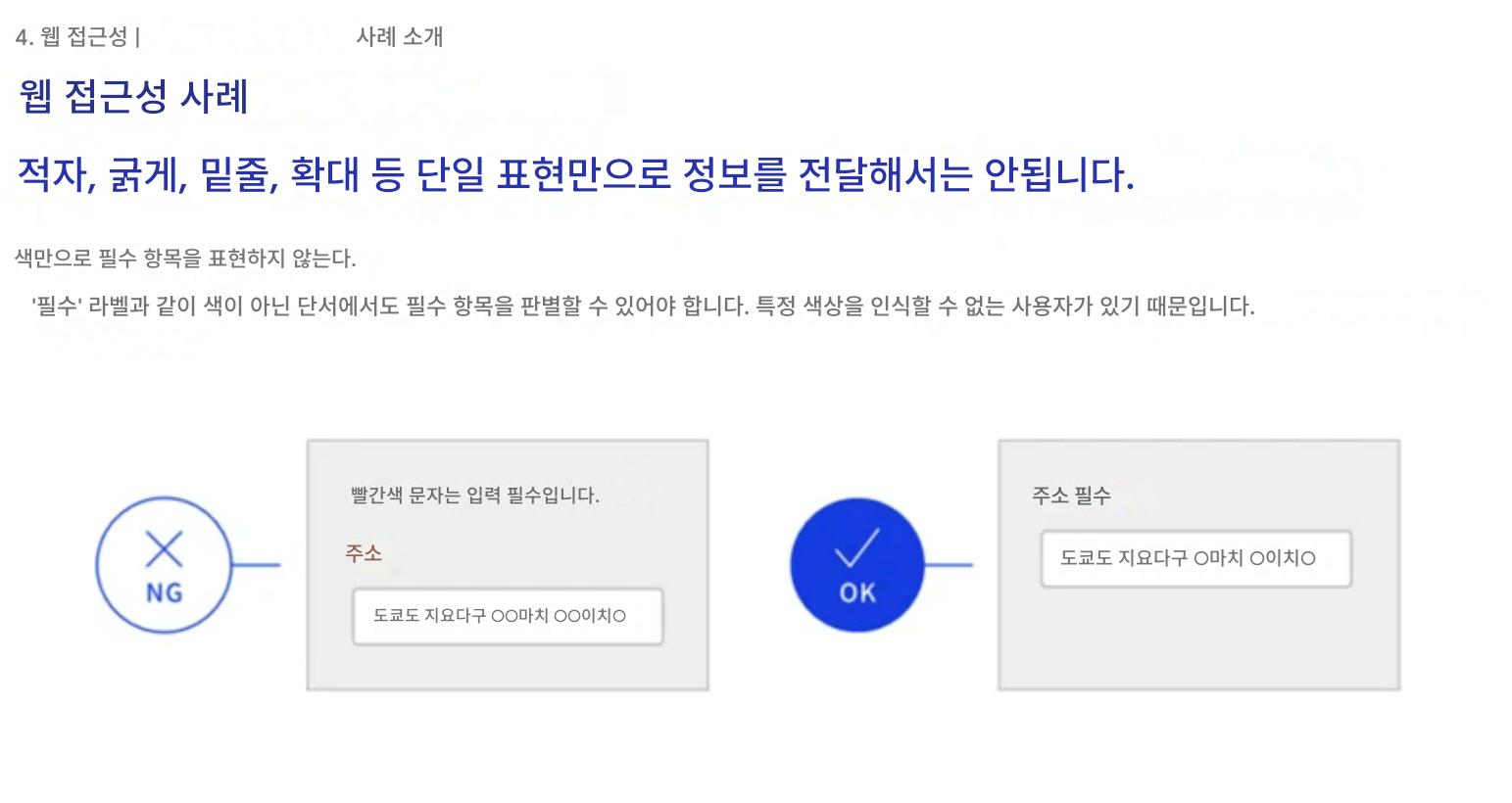 예를 들어, 웹 서비스에서 주소 입력을 요구할 때가 있다. 이때 “빨간 글자 부분은 필수 입력”이라고 하며, 항목명 “주소”를 빨간색으로만 표시한다면 어떨까.