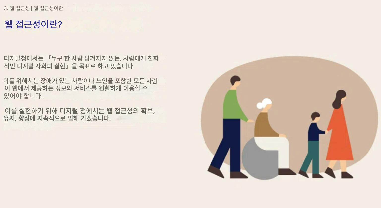 이를 위해서는 장애가 있는 사람이나 고령자 등 모든 사람이, 웹을 통해 제공되는 정보나 서비스를 원활히 이용할 수 있어야 한다.