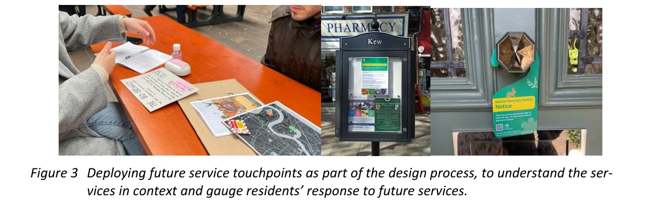 [그림 3] 디자인 프로세스의 일환으로 미래 서비스의 접점(touchpoints)을 현장에 배치하여, 해당 서비스가 작동하는 맥락을 이해하고, 주민들의 반응을 측정하는 모습.