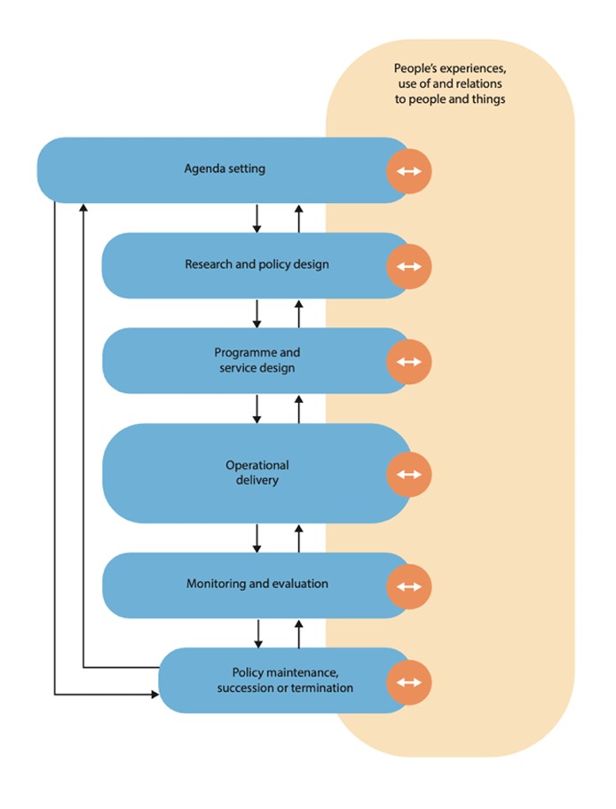 우리가 제시하는 프레임워크는 정책 사이클의 모든 단계와 경험 및 사용의 세계(맥락화된 시민의 삶) 간의 연결을 이중 화살표로 표시하고 있다.
