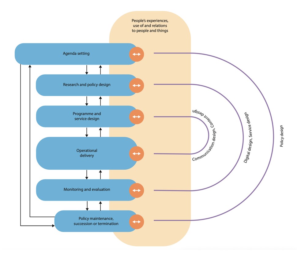 파란 원(정책 사이클의 단계)과 주황색 상자(시민의 시스템 경험)의 교차점에서 공공디자인 실천은 경험에 대한 이해를 연결하고 동원하며, 이를 통해 정책, 전략, 운영을 더 구체적이고 목적지향적으로 만든다. 그림 1에서는 각 단계 끝에 작은 원과 화살표로 이 과정을 시각화하였다.
