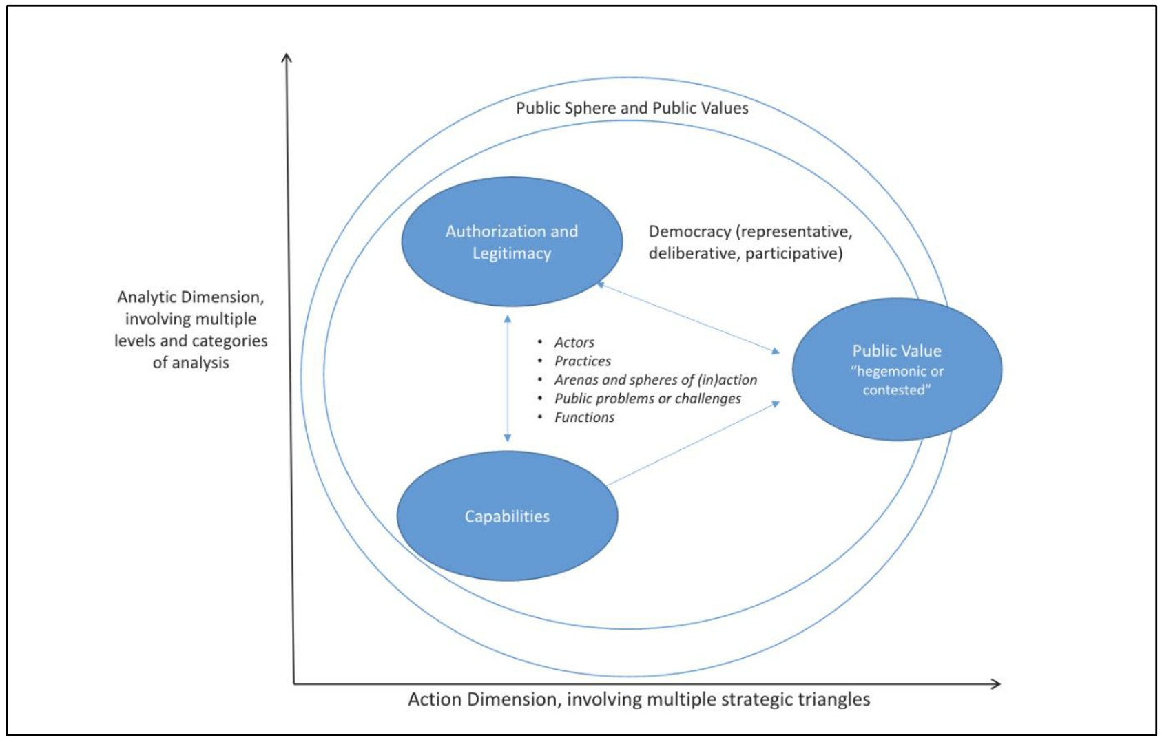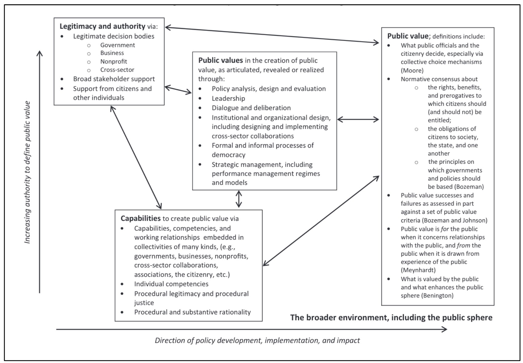 브라이슨, 크로스비, 블룸버그(Bryson, Crosby and Bloomberg, 2015)는 무어의 전략적 삼각형(strategic triangle)을 새롭게 발전시켜 ‘공공가치 거버넌스 삼각형(public value governance triangle)’이라는 새로운 틀을 제시하였다(그림 2 참조).