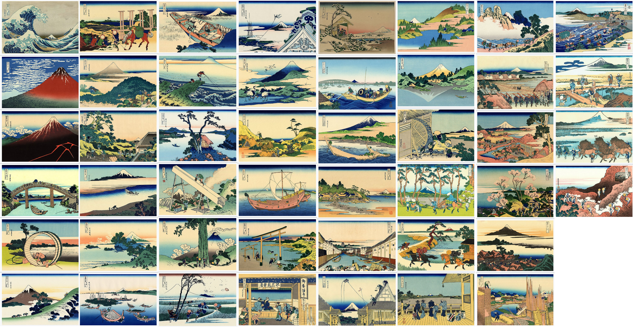 호쿠사이의 가장 유명한 작품은 작가가 70세가 넘었을 때 제작한 "후지산 36경" 연작이다. 제목과는 달리 실제로는 다양한 계절과 기상 조건에서의 후지산을 보여주는 46장의 판화이다. 당초 36점으로 발행되었지만, 그림이 인기를 얻게되자 이후 10점이 추가 제작(위 그림 중 오른쪽의 10개)되었다. 초판은 그가 70세쯤이던 1823년 무렵부터 만들기 시작하여 약 74세 무렵(1831년부터 1835년으로 추정)에 걸쳐 간행된 것으로 추정된다. 예술적 표현의 독창성과 후지산을 바라보는 놀랍도록 다양한 관점은 호쿠사이의 창의성을 증명한다. 그중 그의 대표작 '가나가와 앞바다의 높은 파도'가 포함되어 있다.