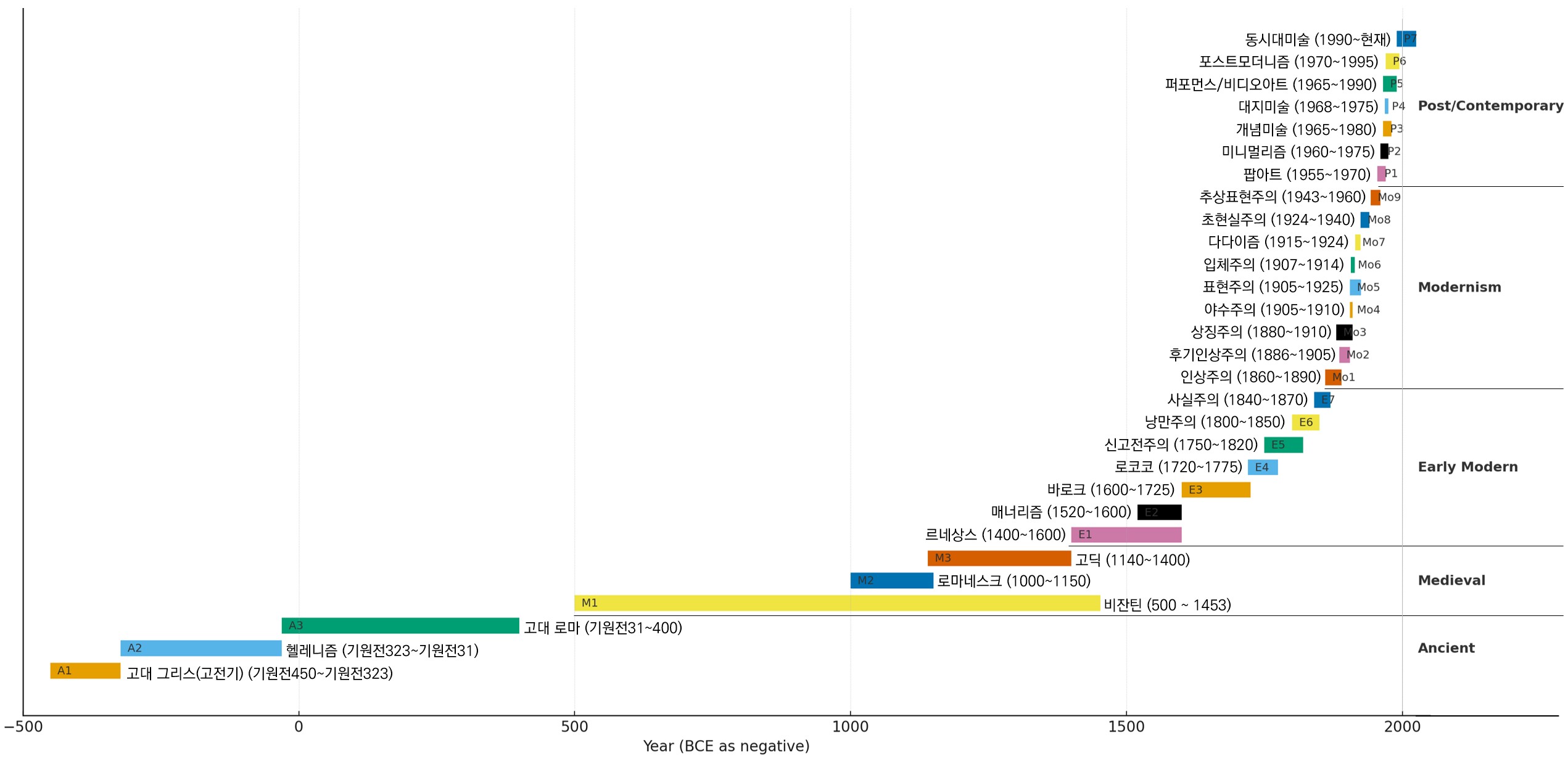 * 표준 교과서들에서 통용되는 기간 범위를 사용했으나, 학자·지역에 따라 사조별 경계 연도(특히 비잔틴·르네상스 전환, 사실주의/모더니즘 접점, 동시대 시작점)는 ±10~30년 차이가 있을 수 있음.