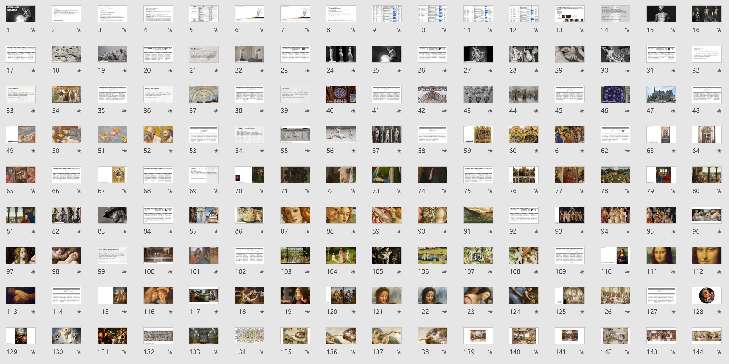 | 23 | 르네상스 | 《천지창조 (시스티나 예배당 천장화)》 | 1508–1512 | 인간과 신의 만남을 그린 르네상스 조각과 회화의 정점. 인체 표현의 완벽한 이상화. | 미켈란젤로 (1475~1564) | The Creation of Adam | 바티칸 시국 | 시스티나 경당 |