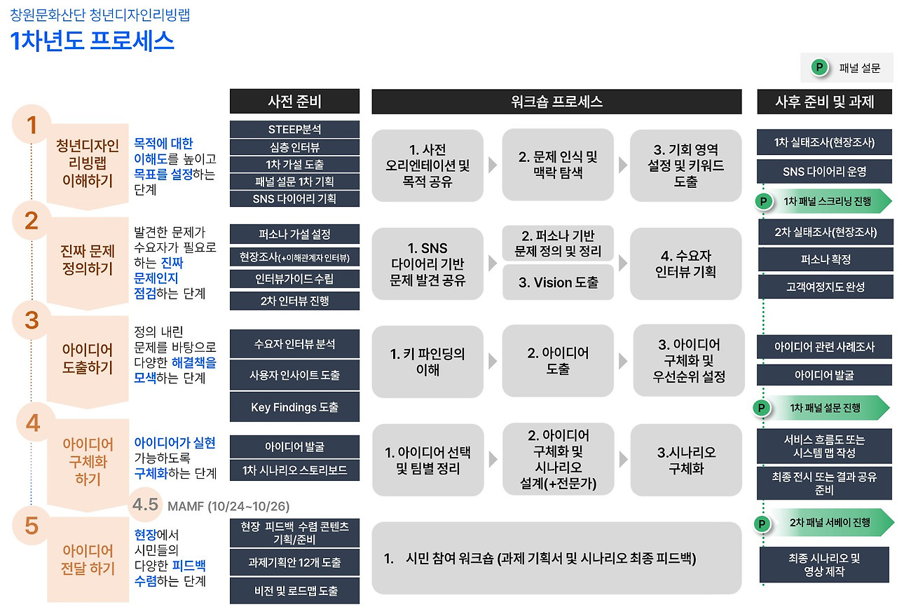 청년디자인리빙랩은 문화선도산단 정책의 실행 방법이다. 그 실행 방법은 익숙한 행정의 방식과는 거리가 있다. 하드웨어 구축 중심으로 추진되어 온 정부 대규모 공모 사업을, 지역 주민의 경험과 의견이 반영된 미래 계획으로 전환하기 위해 디자인 방법을 활용한다. 계획을 먼저 세우고 주민을 설득하는 대신, 청년과 주민, 공무원, 디자이너가 함께 문제를 탐색하는 과정부터 시작한다. 리빙랩이라는 이름처럼, 완성도를 목표로 하지 않고 빠르게 가설을 세우고 현장에서 검증하는 실험을 한다. 그래서 1차년도에 무엇을 만들었는가보다, 무엇을 관찰했고 어떤 질문을 새로 얻게 되었는지를 찾는 것이 더 중요했다. 청디랩의 성과는 특정 과제나 아이디어보다, 정책이 만들어지는 방식 자체가 달라졌다는 점에 있다.